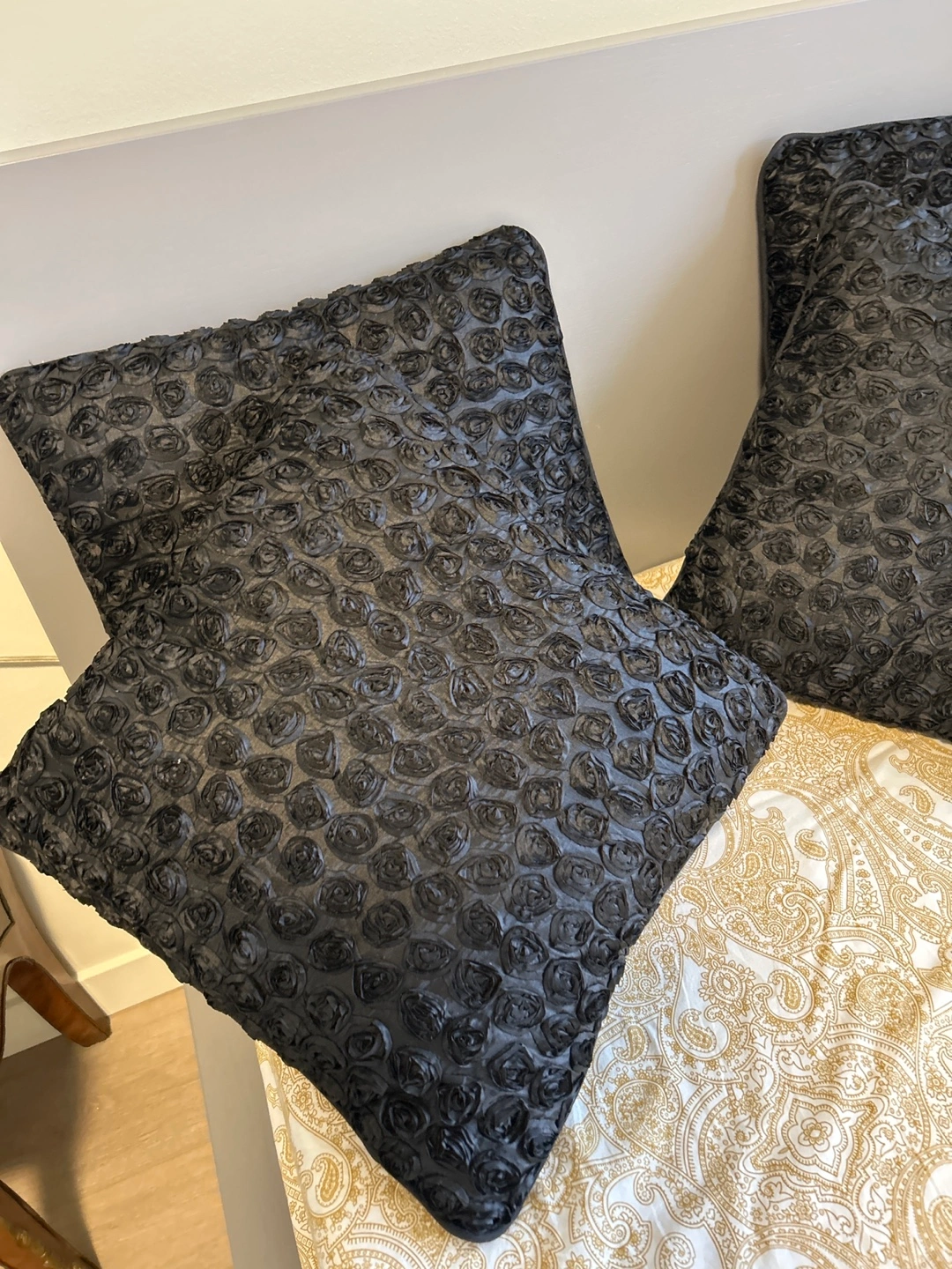 A decorative throw pillow with a textured black rose design. Its unique floral pattern adds a touch of elegance to any room. The pillow's material gives it a lovely sheen. Perfect for accenting a couch or bed! 4$ each