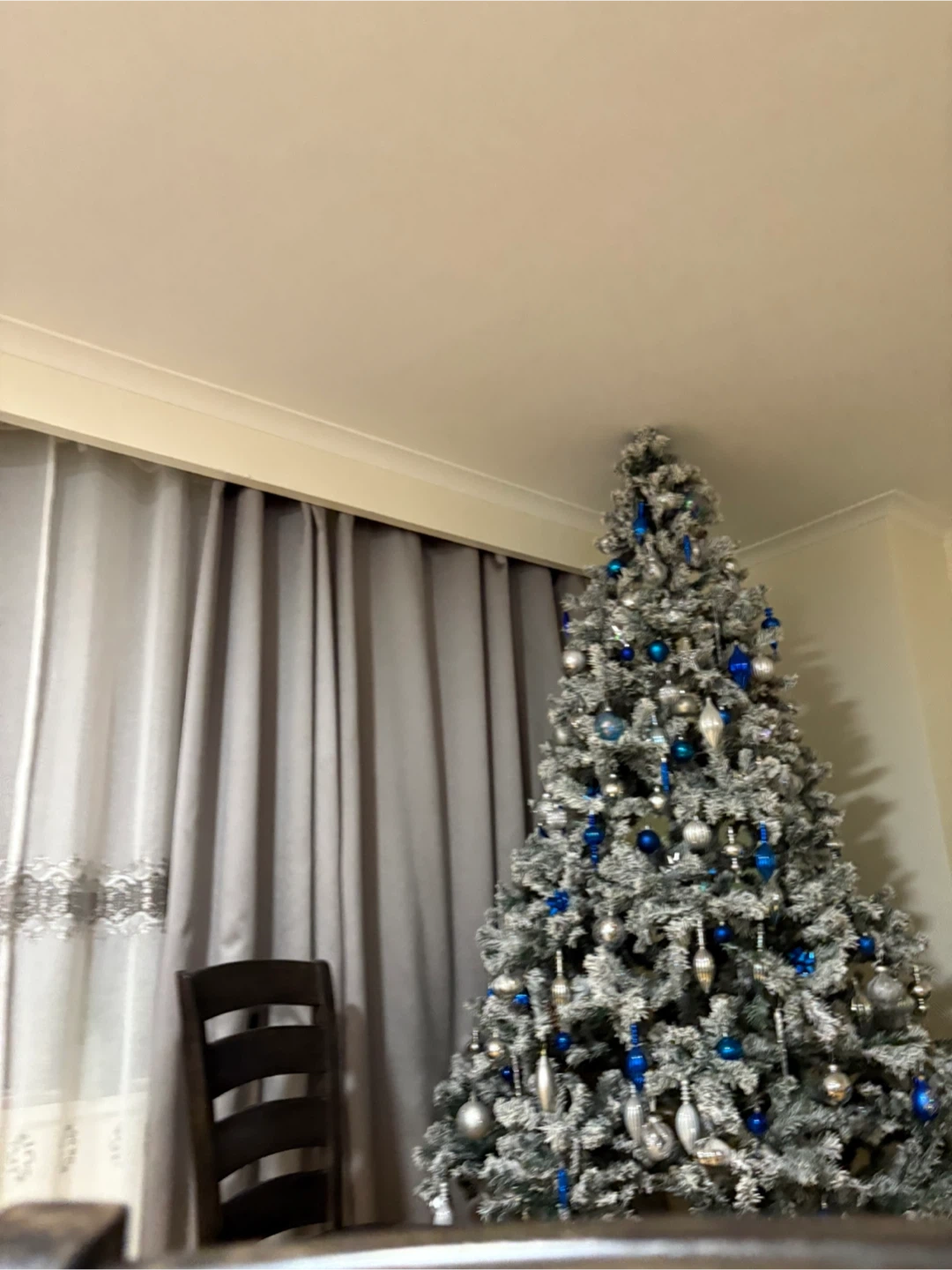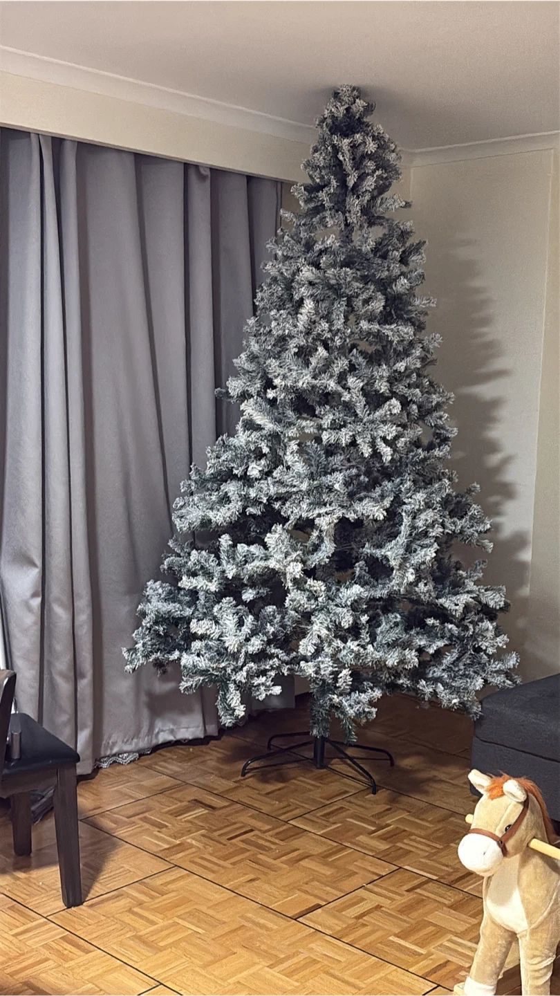 Beautiful flocked artificial Christmas tree, ready for your holiday decorations. This tree's branches are pre-dusted with a snowy white flocking. It's easy to set up and will bring festive cheer to your home. Comes with a sturdy stand. also give fir free blue&gray color decoration. comes disable you can pick up with a car don’t need a truck..