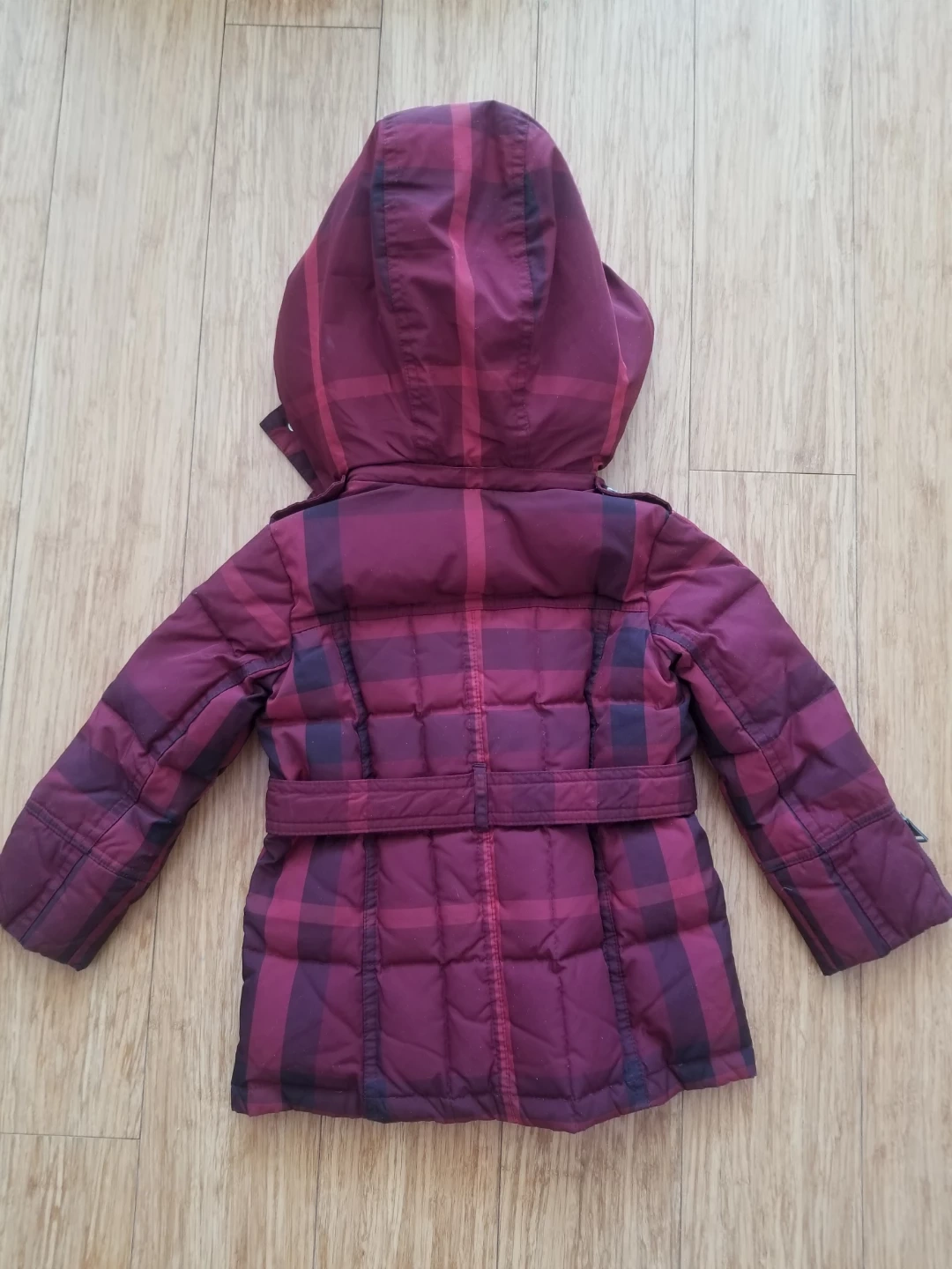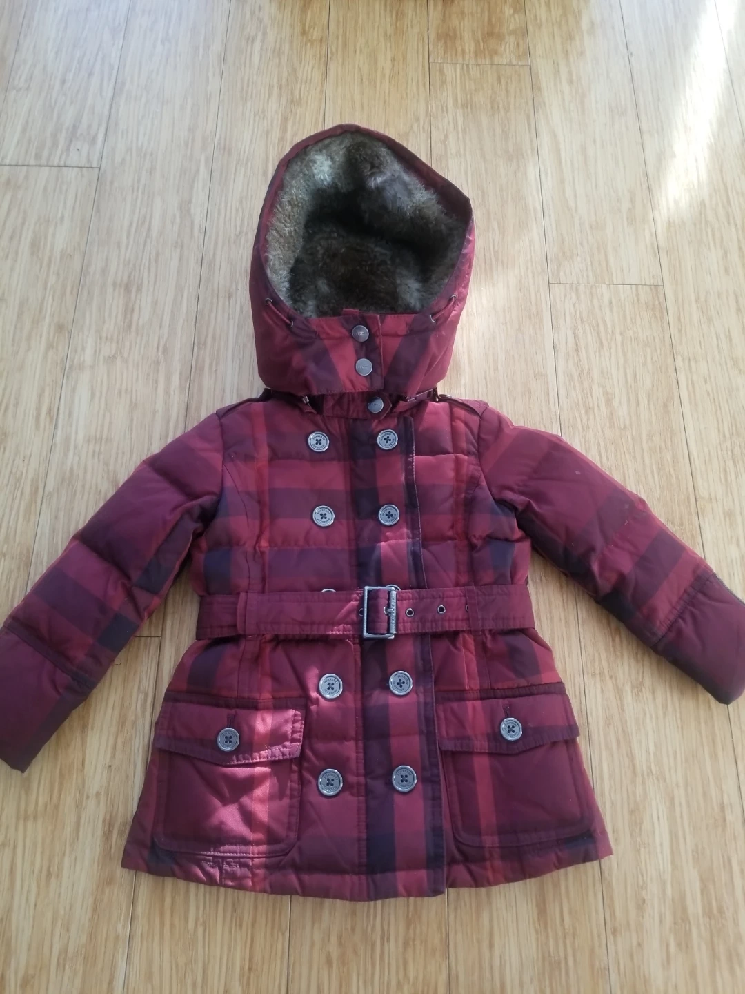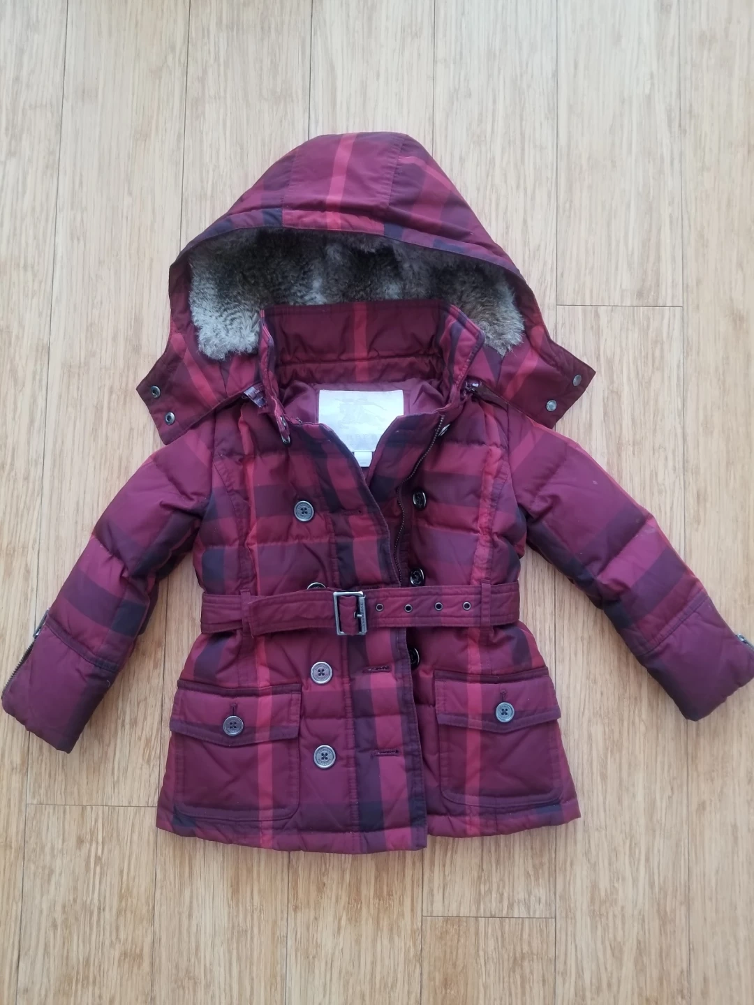 Burberry Children's down puffer jacket in a classic plaid pattern. It features a removable hood with faux fur trim and a tie belt at the waist. Front button and zip closure with multiple pockets. Small stain on left sleeve. Otherwise excellent co edition.