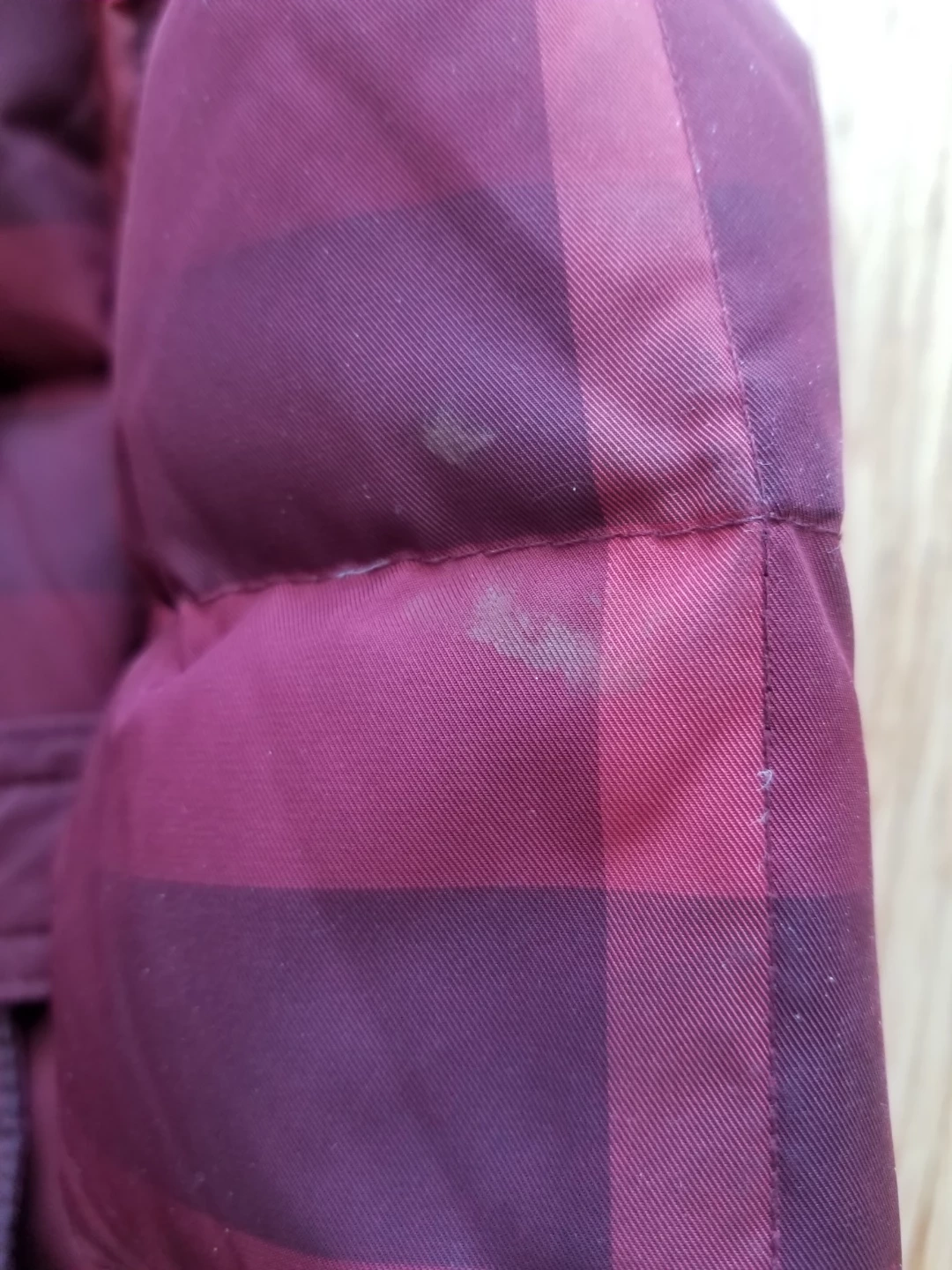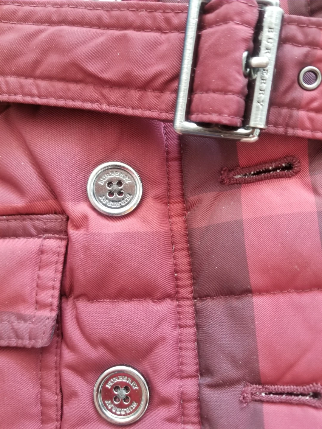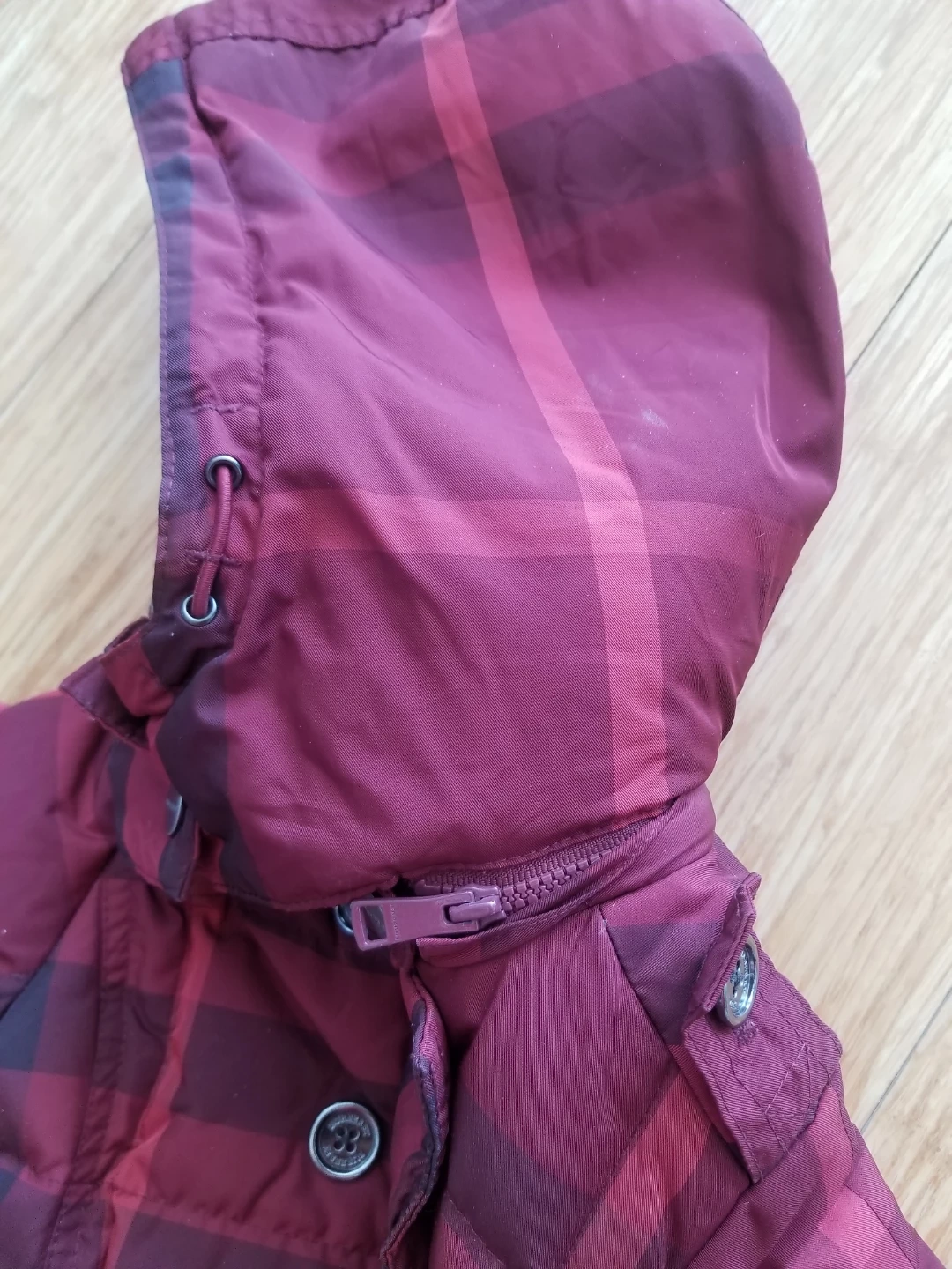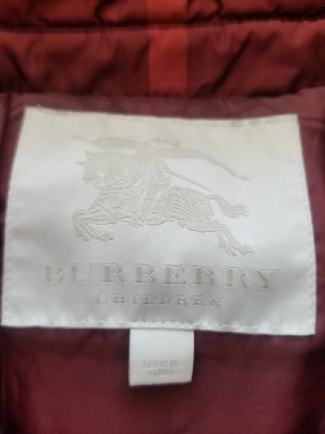 Burberry Children's down puffer jacket in a classic plaid pattern. It features a removable hood with faux fur trim and a tie belt at the waist. Front button and zip closure with multiple pockets. Small stain on left sleeve. Otherwise excellent co edition.