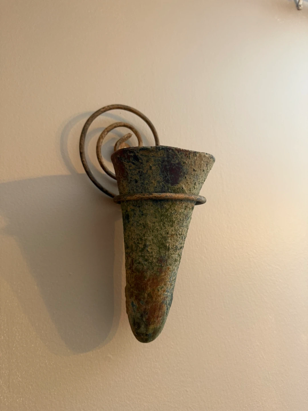 This is a rustic wall-mounted planter or holder. It's made from a textured material with a greenish-blue patina and features a coiled metal accent for hanging. It's great for small plants or decorative items!