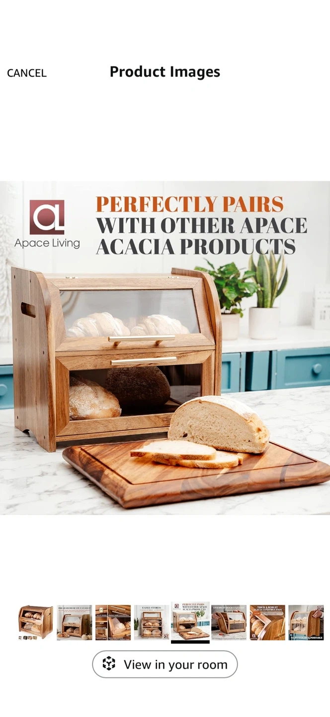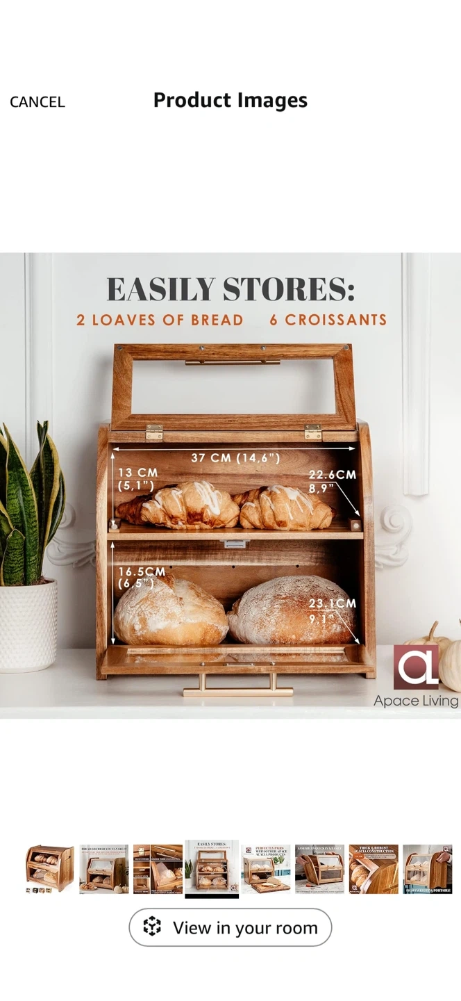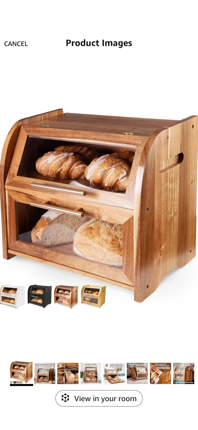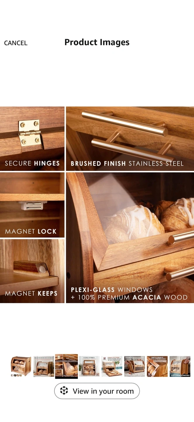 Thick & robust acacia wood construction. It features secure hinges, a magnet lock, and brushed finish stainless steel handles. Plexi-glass windows allow easy viewing of contents. This bread box easily stores 2 loaves of bread or 6 croissants.