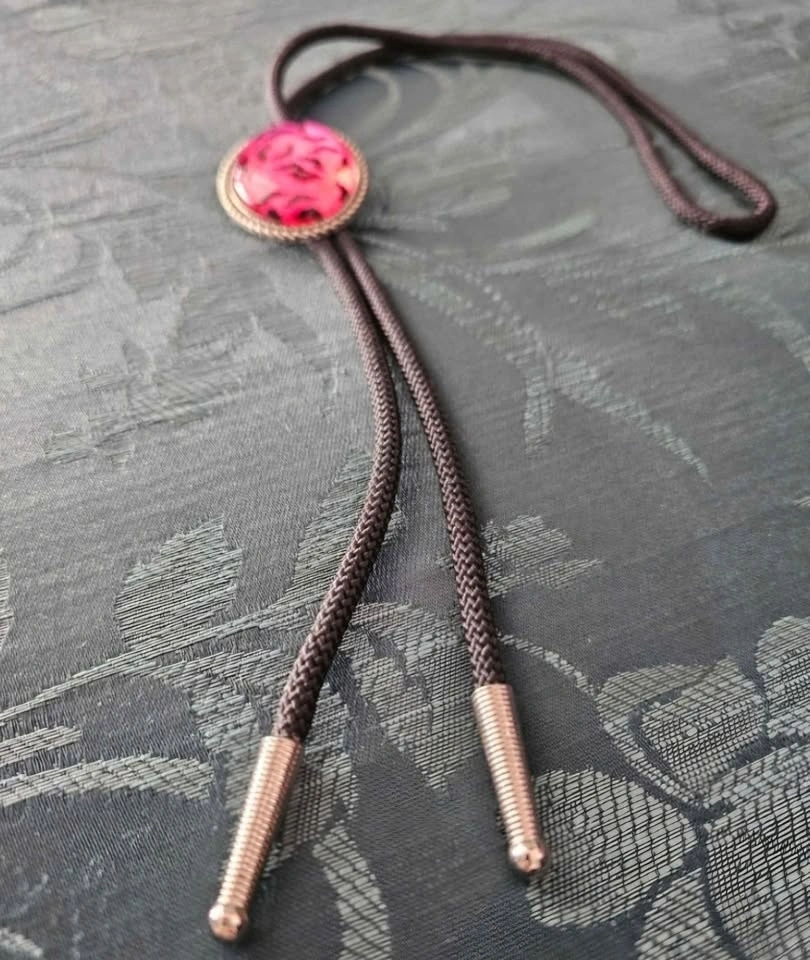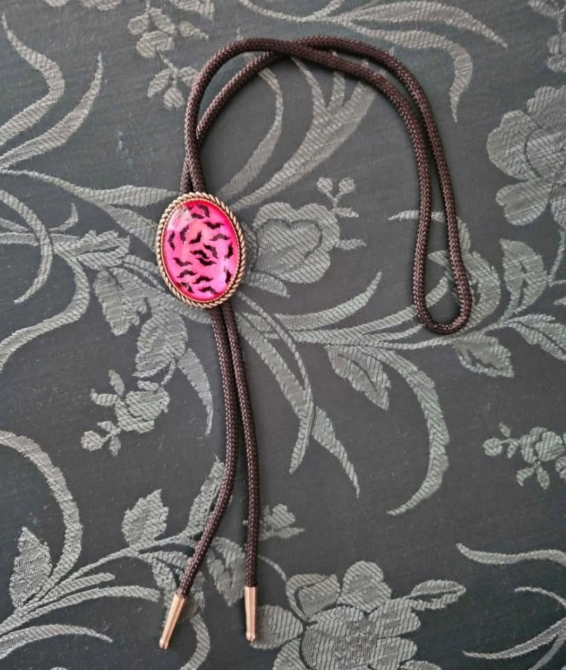 Cute handmade bolo tie with a sparkly bright pink center featuring a design of black bats. Brand new, never worn.