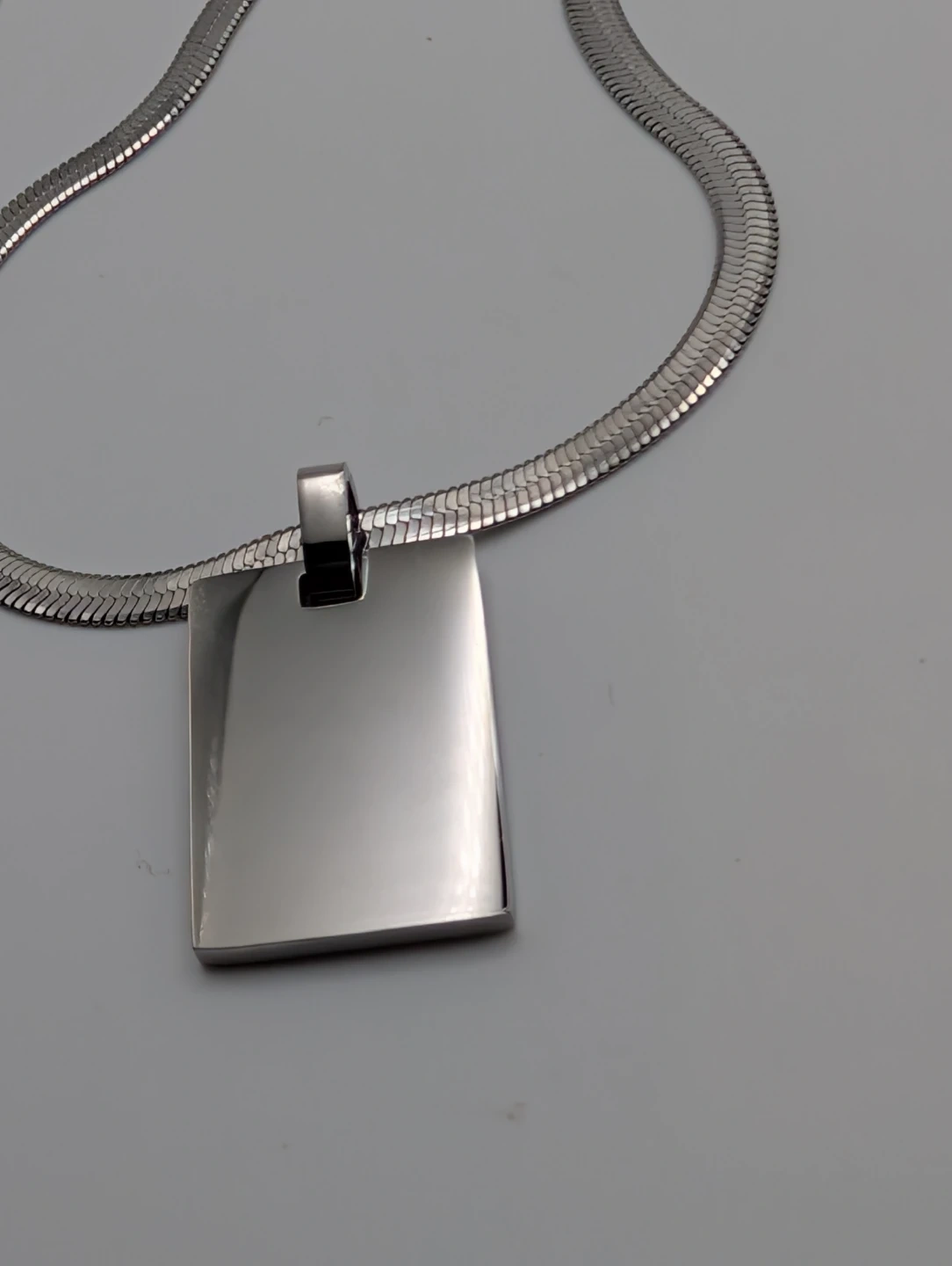 Shiny silver snake chain necklace with a polished square pendant. It's made of stainless steel. This necklace is a simple and elegant accessory.