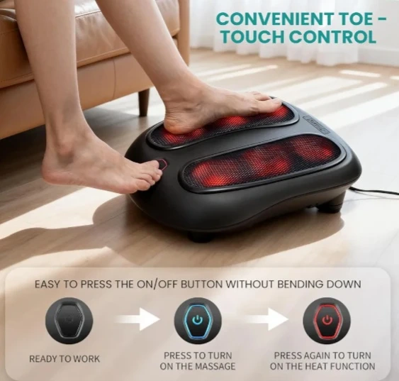 Nekteck foot massager machine with soothing heating and 54 massage nodes. It offers multi-zone massage for feet and calves with bi-directional rotation. Features easy toe-touch controls and fits large feet.