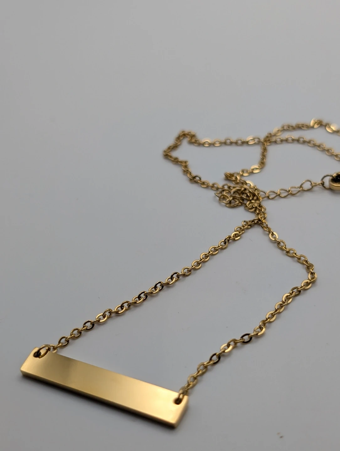 A classic gold bar necklace. It's made of metal and has a simple chain. The bar is blank, perfect for personalization!