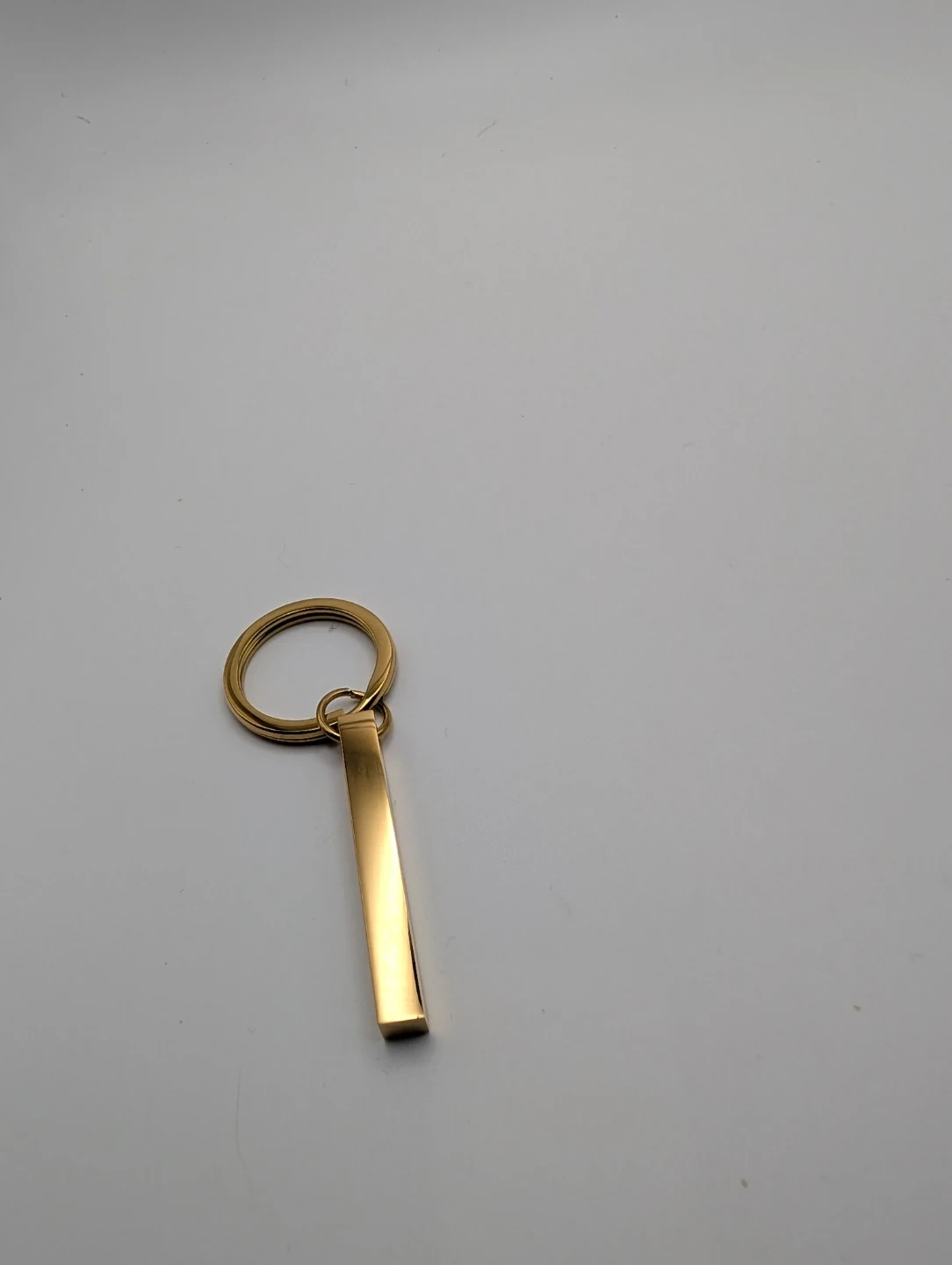 It's a gold-toned metal keychain with a bar pendant. It has a split ring for keys.