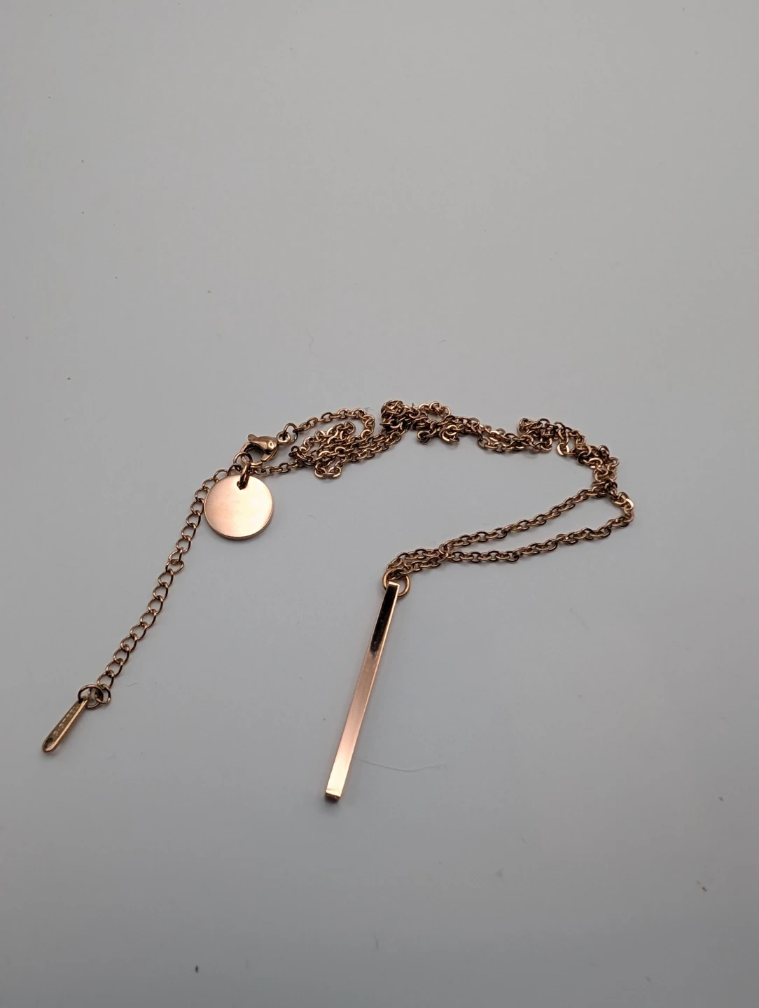 A simple rose gold necklace featuring a bar pendant. It has a delicate chain with an extender for adjustable length. This necklace adds a touch of elegance to any outfit!