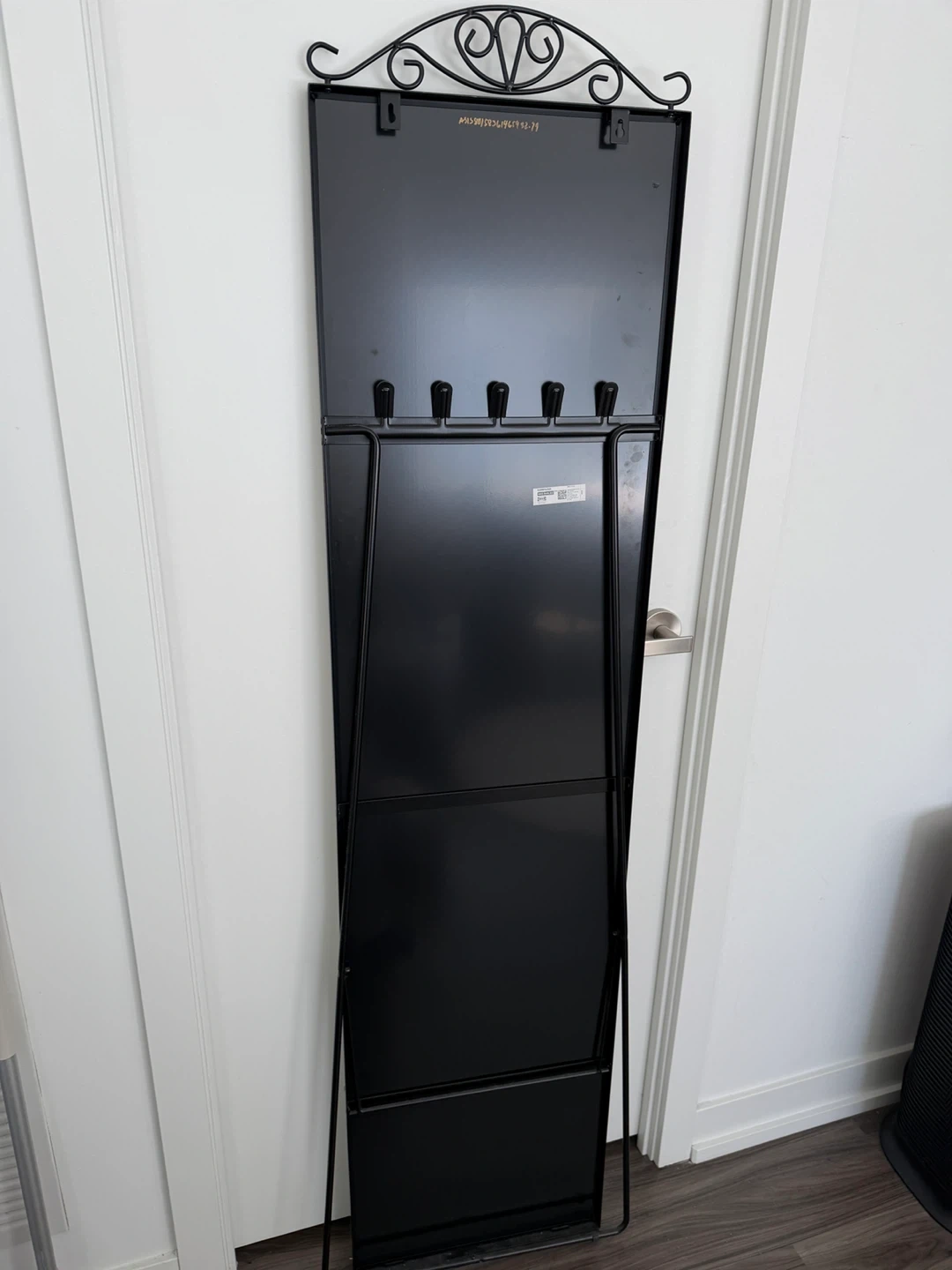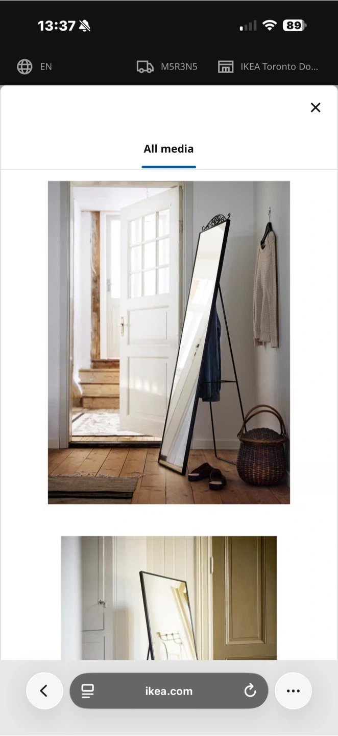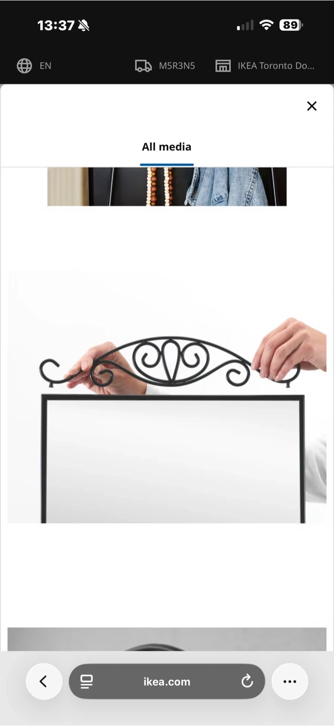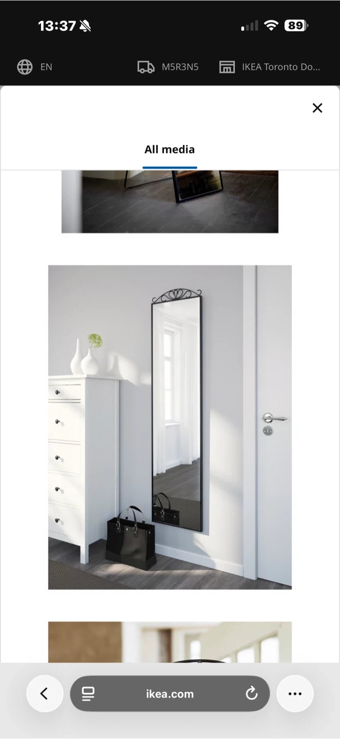This IKEA full-length mirror features an elegant decorative scrollwork top, perfect for adding a touch of style to any room. Its freestanding design makes it easy to place and move. It's a great addition for checking outfits or enhancing the spaciousness of your living area.