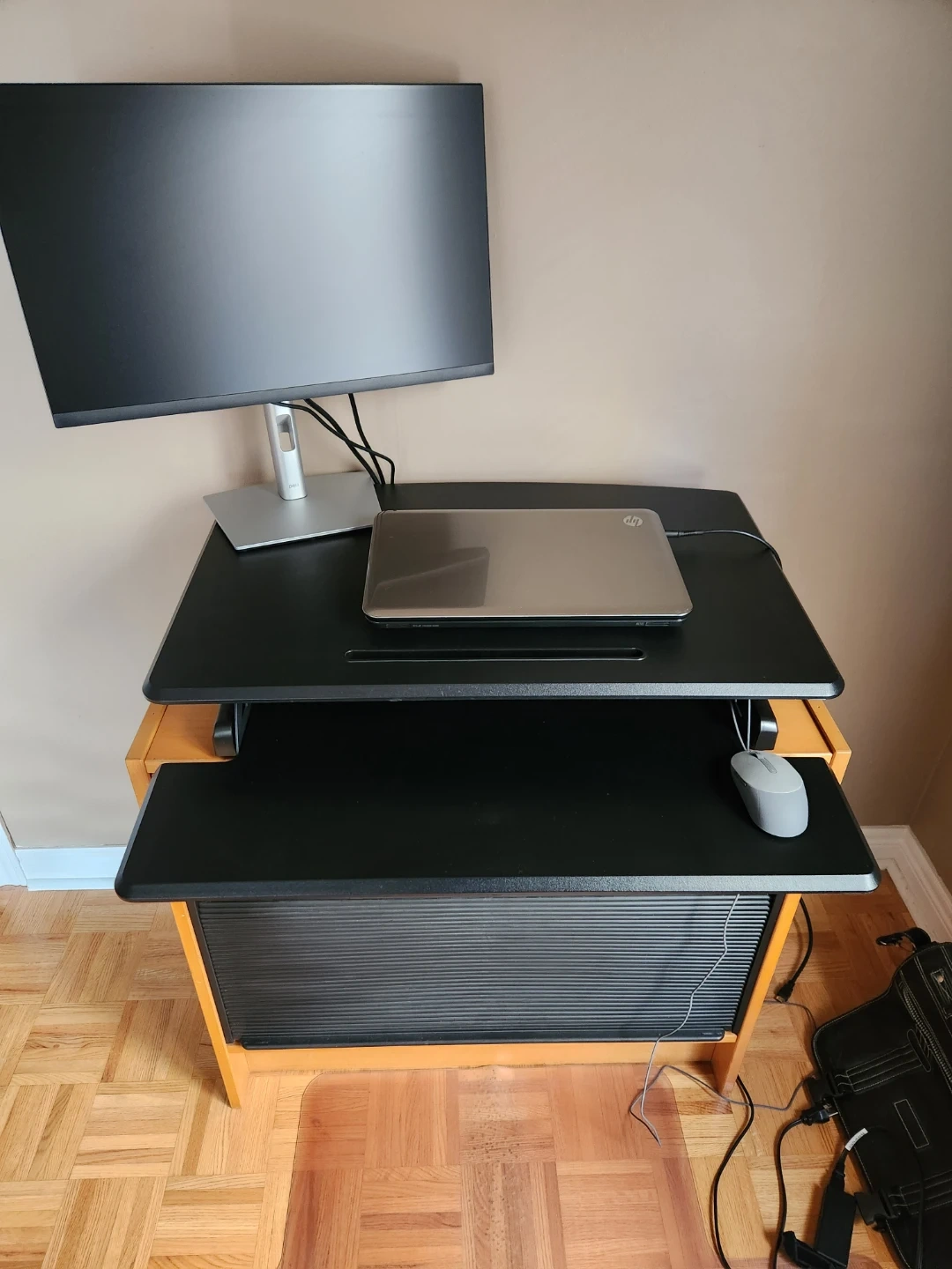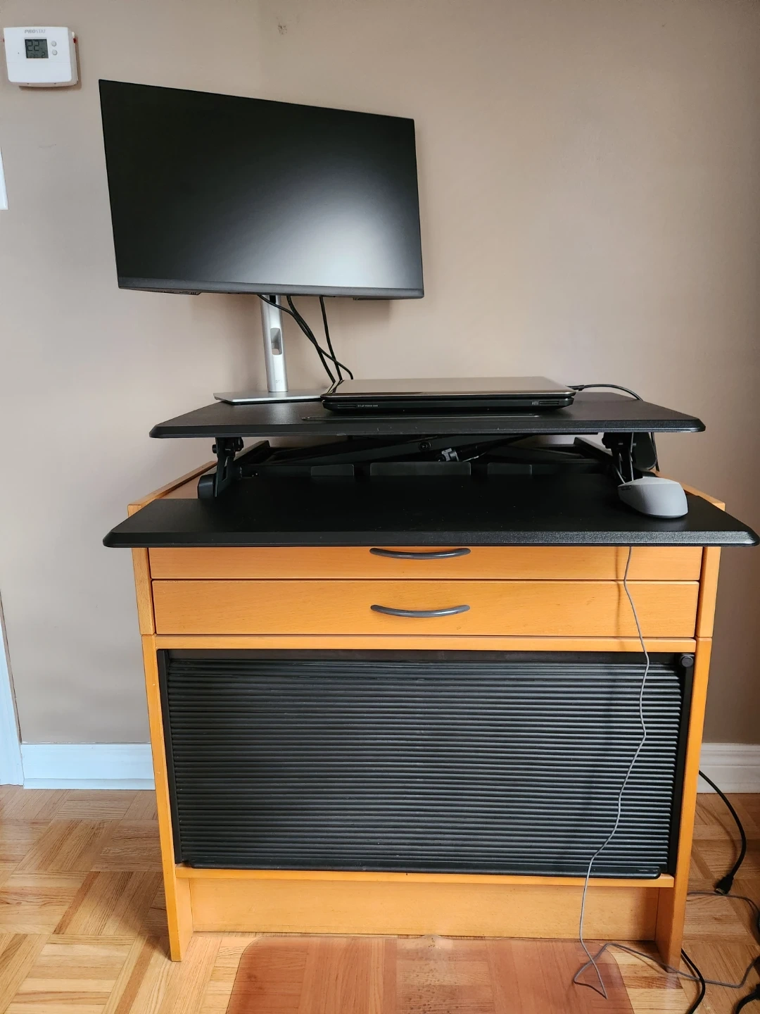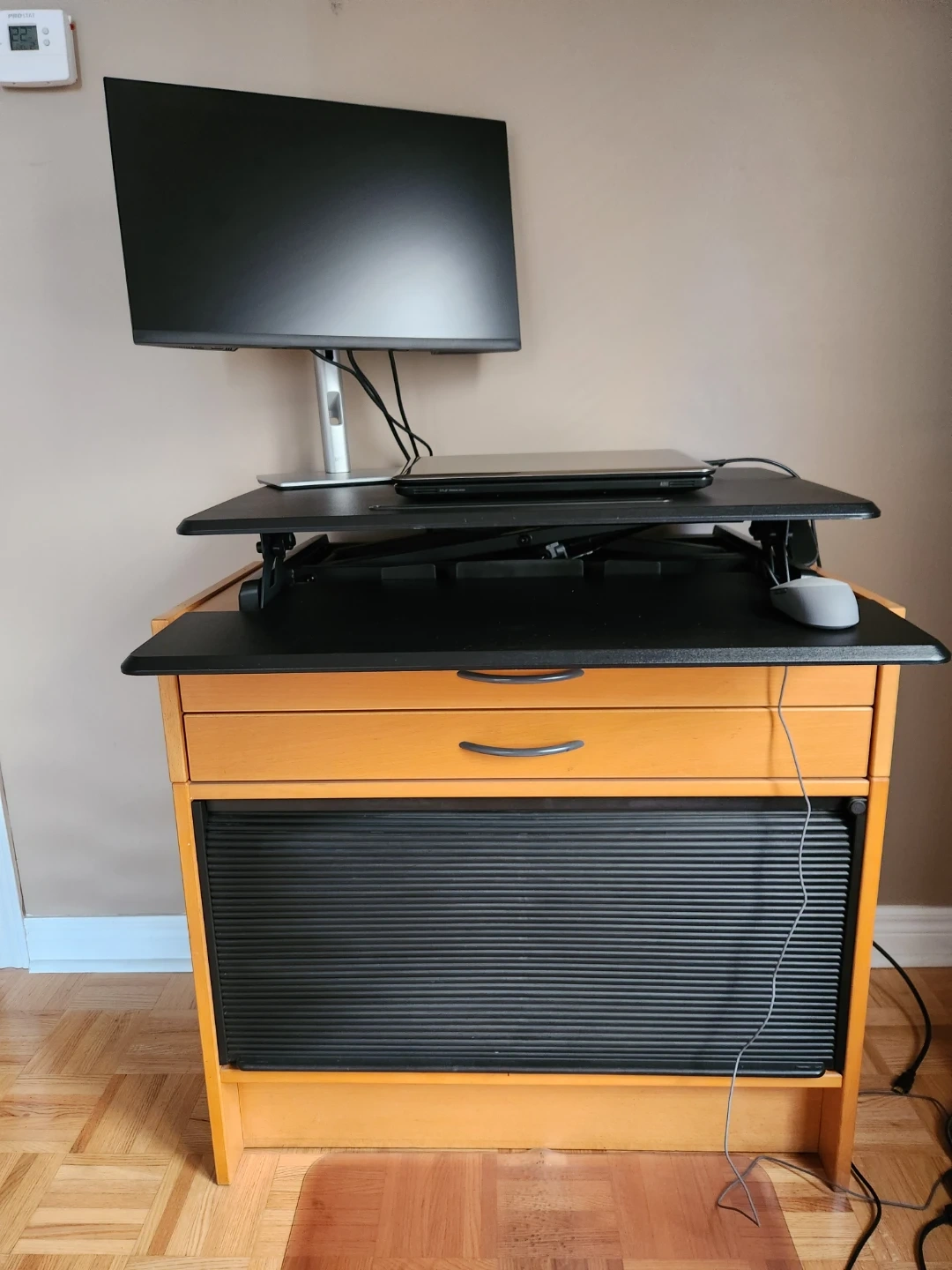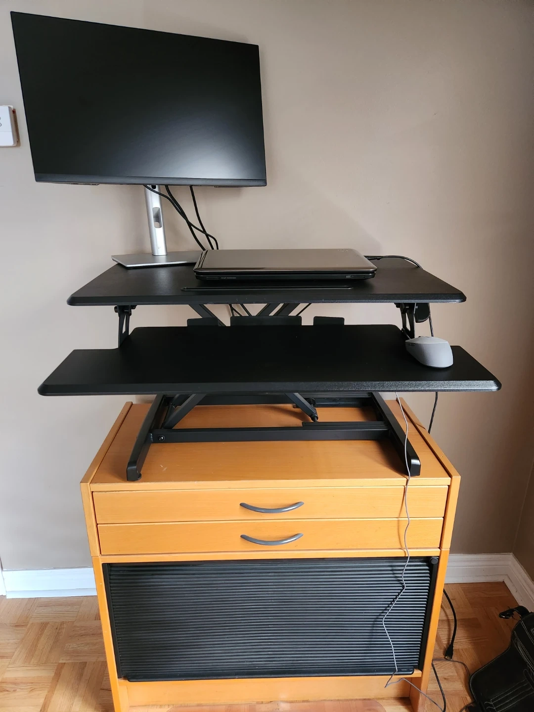 Seville Classics Airlift Height Adjustable Sit Desk Converter Workstation Standing Ergonomic Dual Monitor Riser with Keyboard Tray, Compact 30", Black. Excellent condition, rarely used. Below I've also included a link to a similar item at Staples