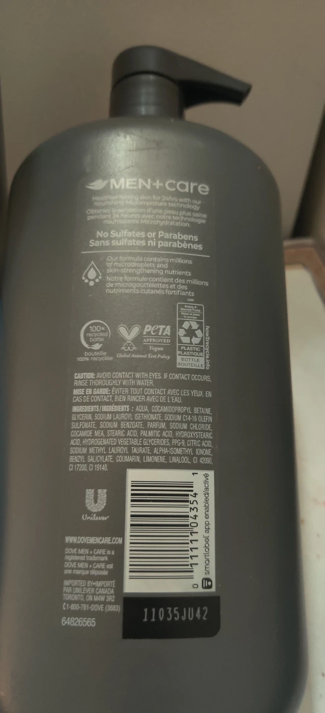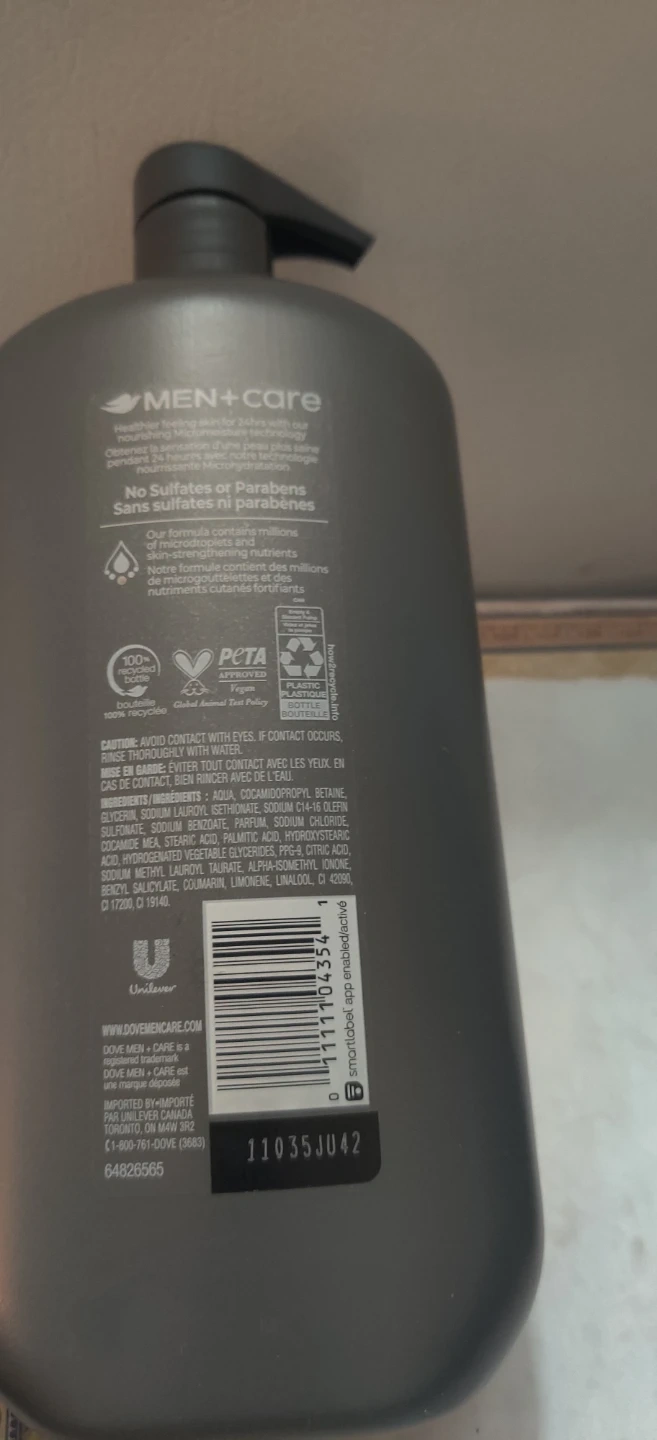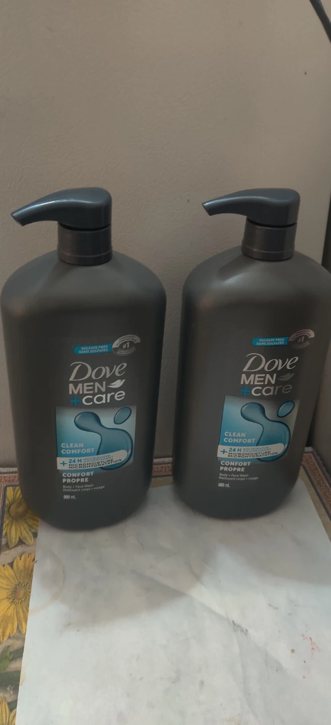 2 Dove Men + Care body and face wash comes in a large 950 mL bottle. It's formulated for clean comfort and 24-hour nourishment with Micromoisture. This wash is sulfate-free and paraben-free.