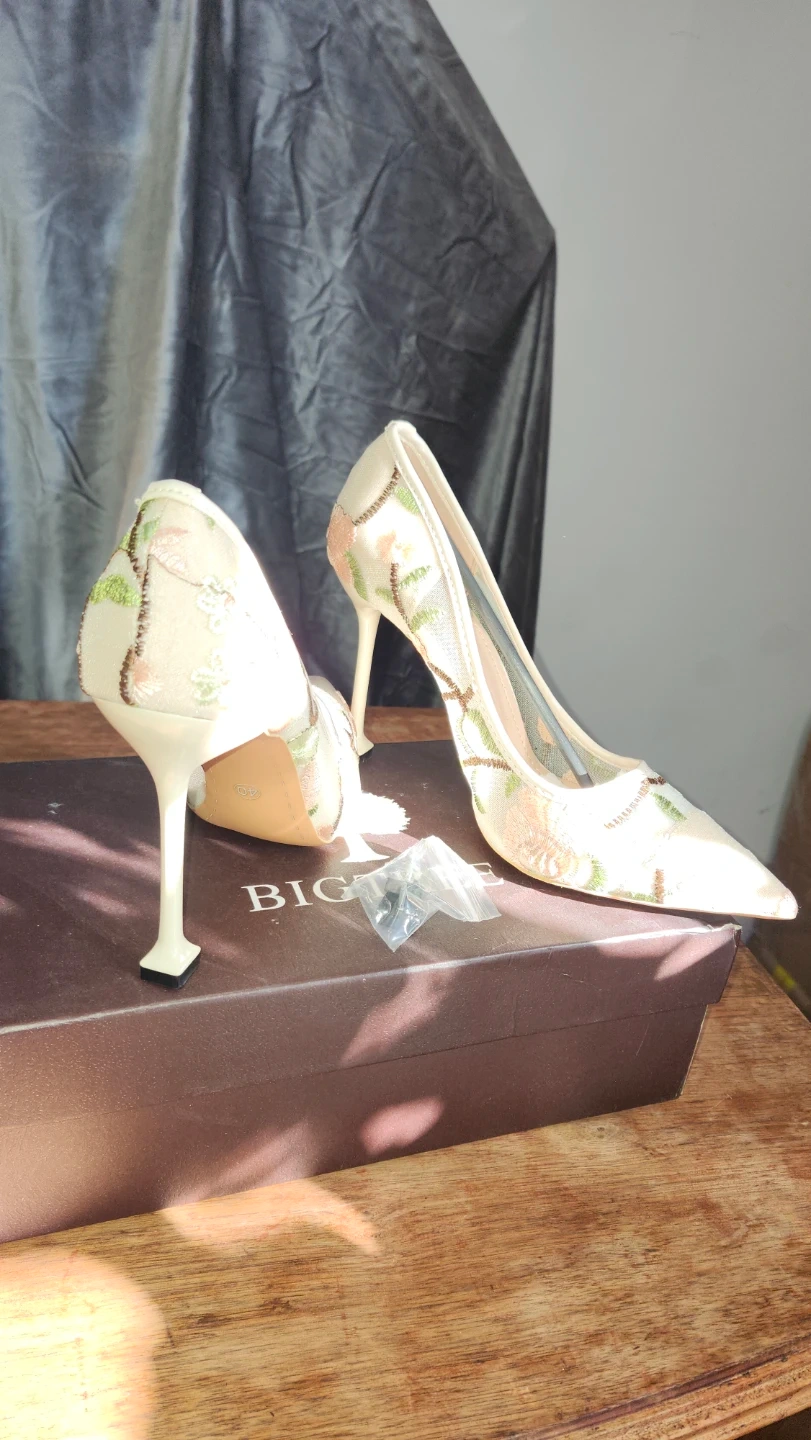 Never worn. Elegant cream-coloured high heel pumps with delicate floral embroidery. These shoes feature a pointed toe and a stiletto heel. They come in their original box with some extra heel tips.
