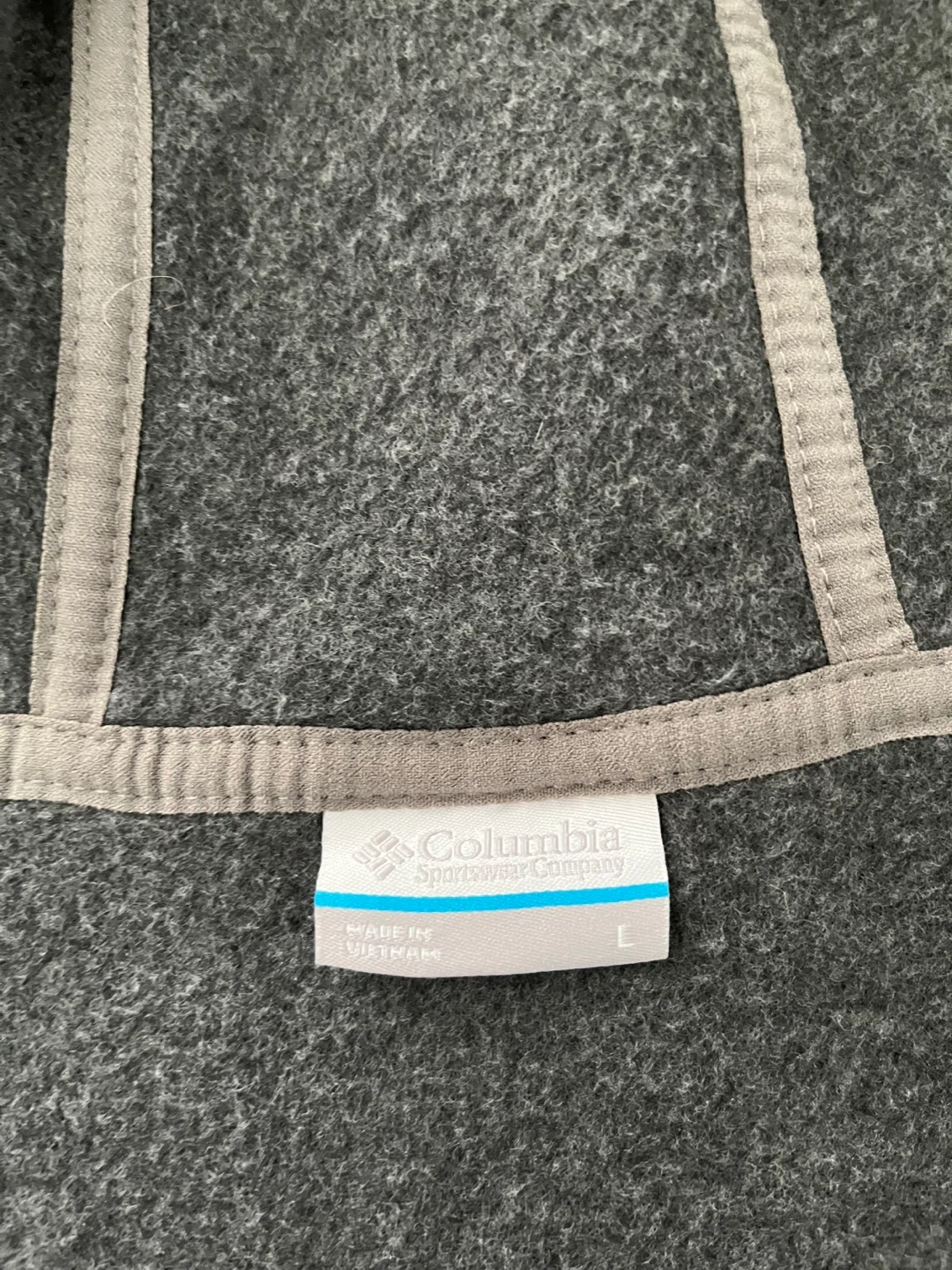 Columbia Sportswear Company fleece jacket in grey. It's a size Large with a hood. Made in Vietnam. This jacket is great for layering on cooler days!