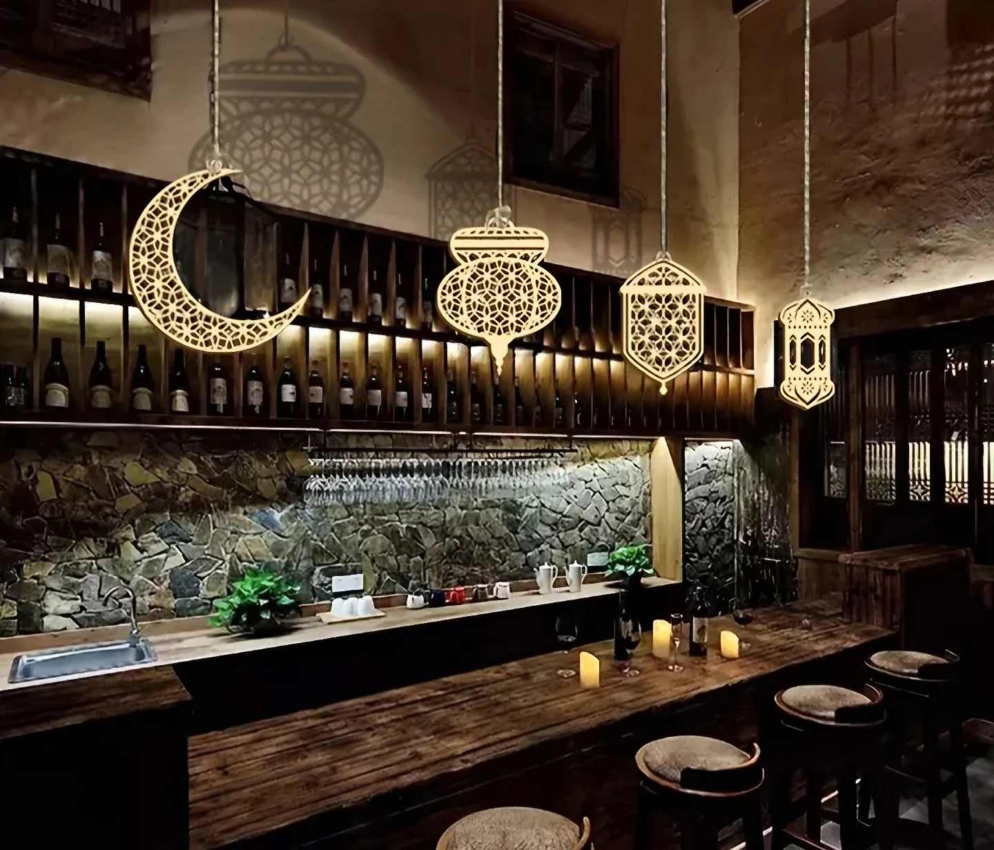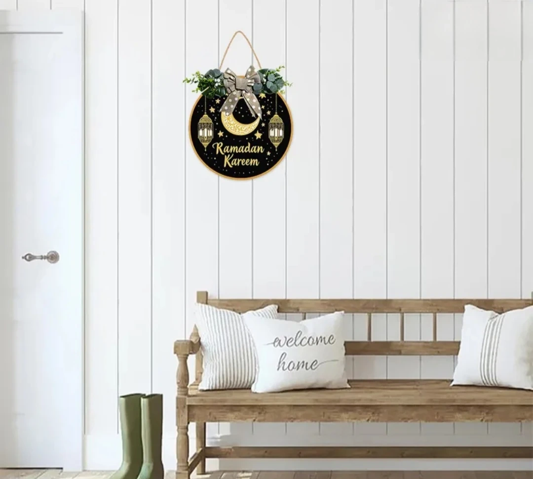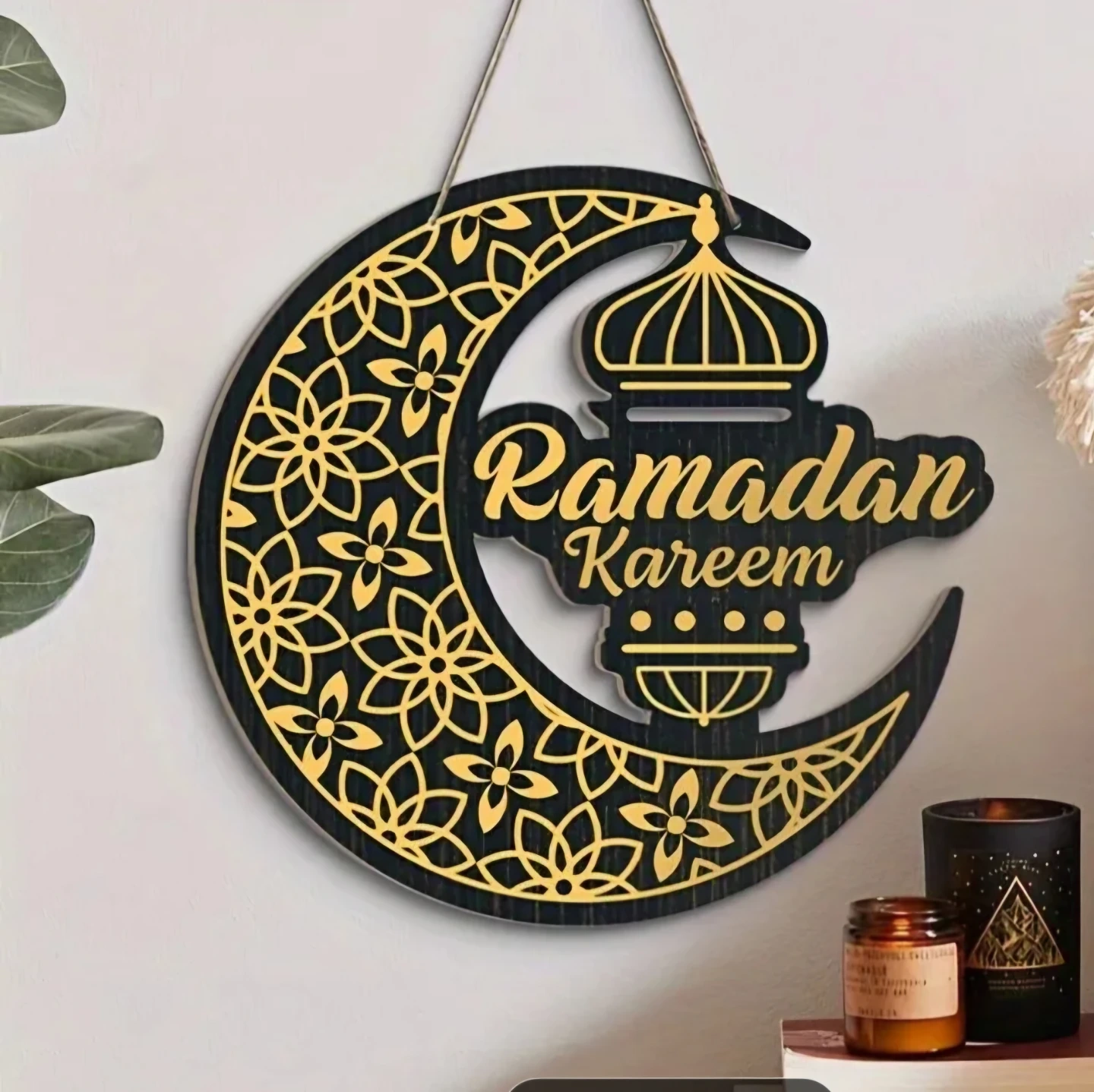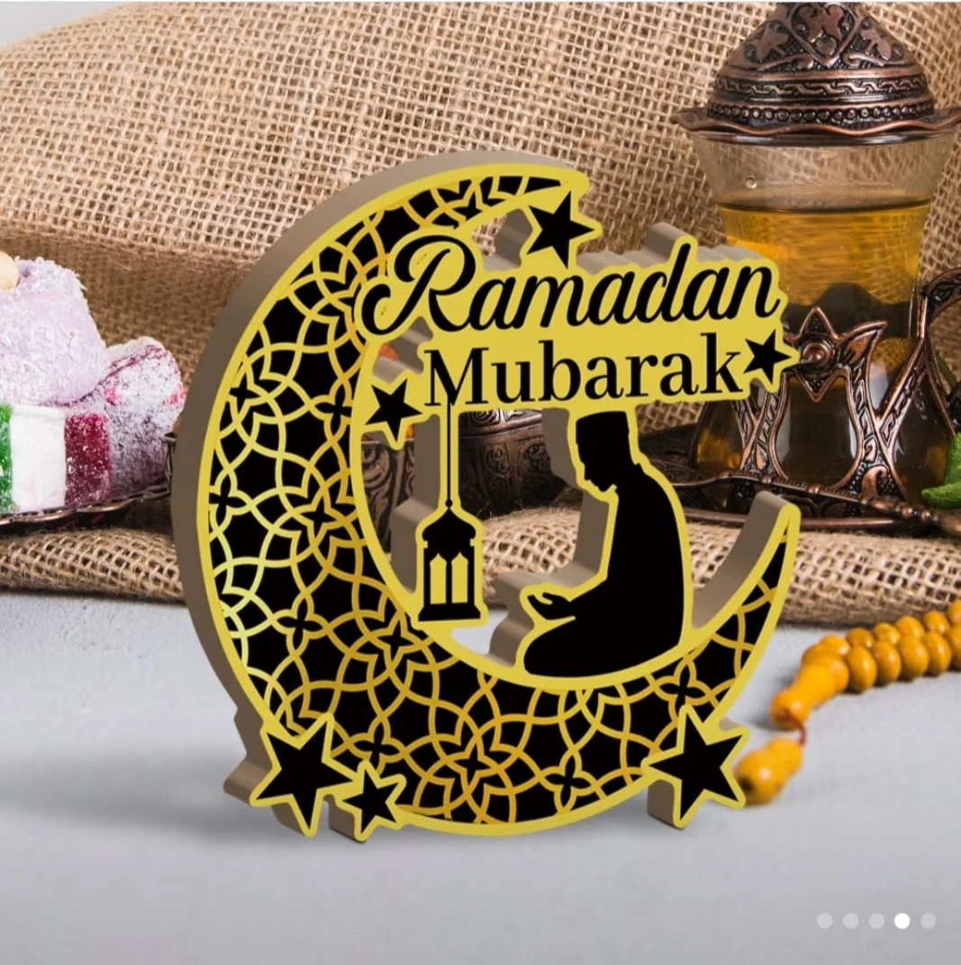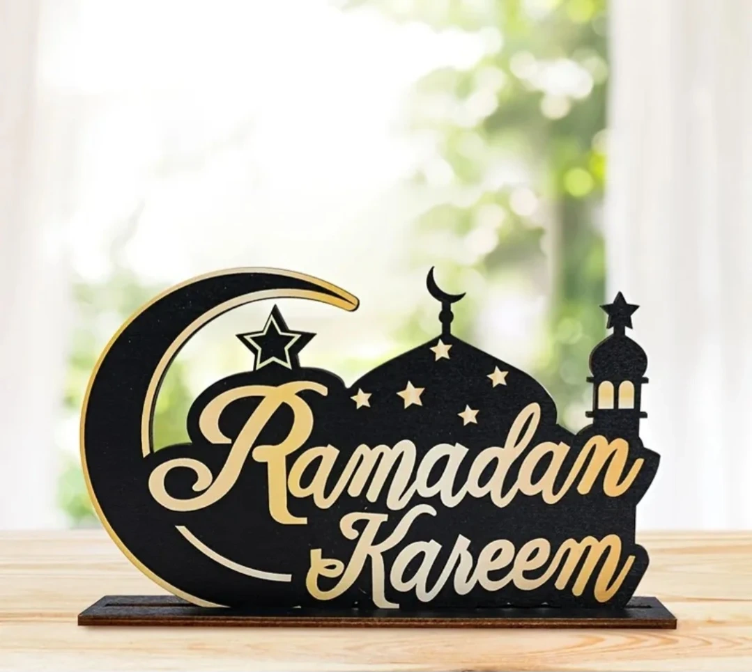 Decorative wooden tabletop centerpiece for Ramadan. It features a crescent moon and mosque design with 'Ramadan Kareem' text. Dimensions are 19cm wide and 11cm high. This piece is great for adding festive decor to your home during the holy month!