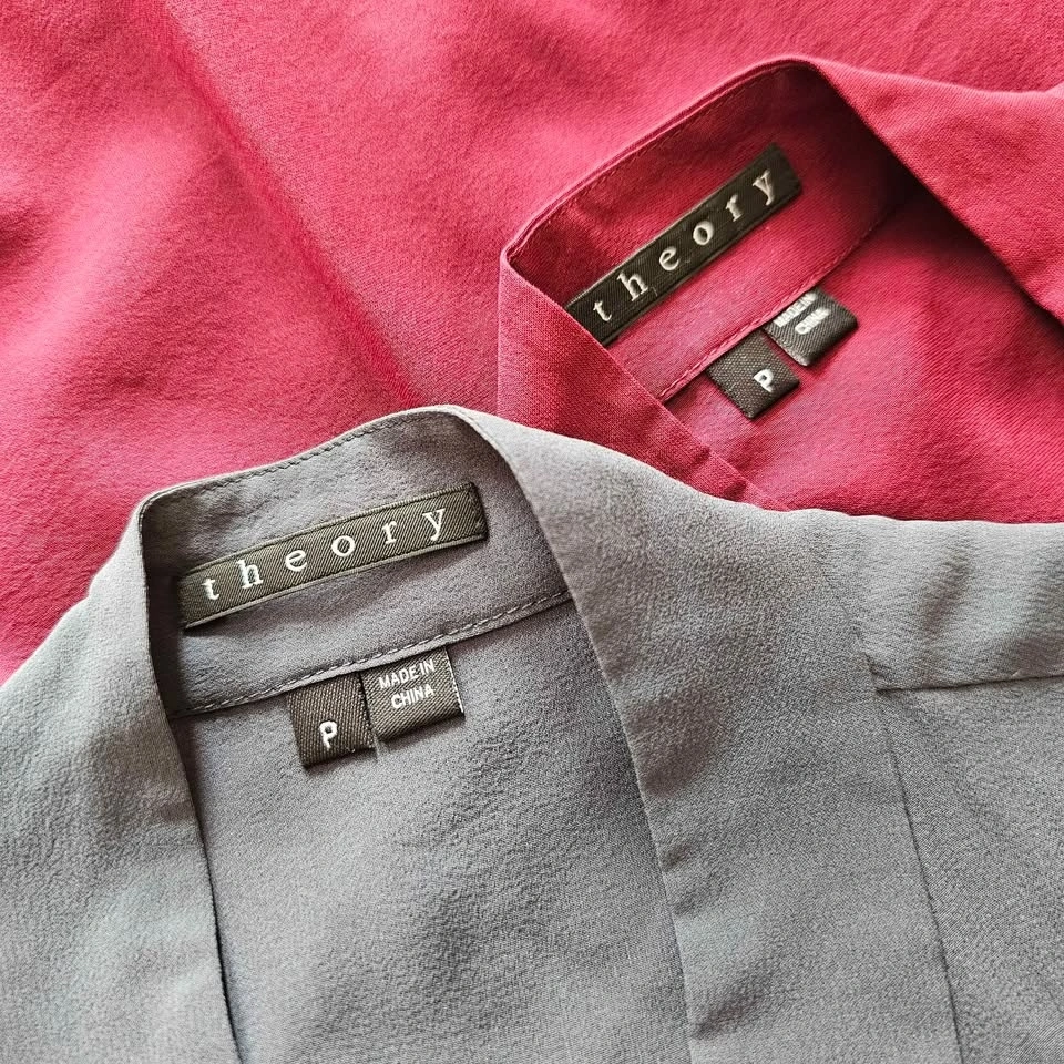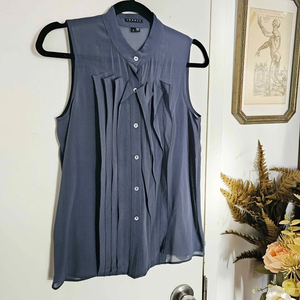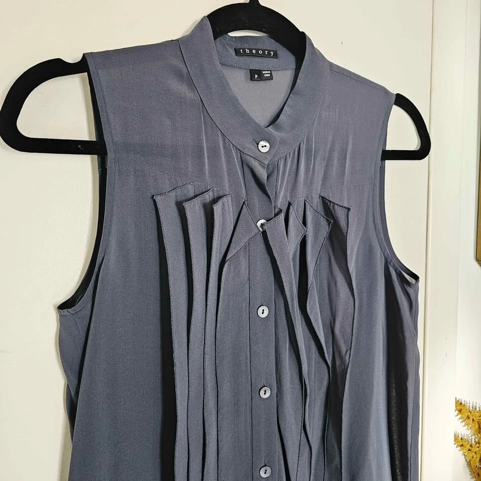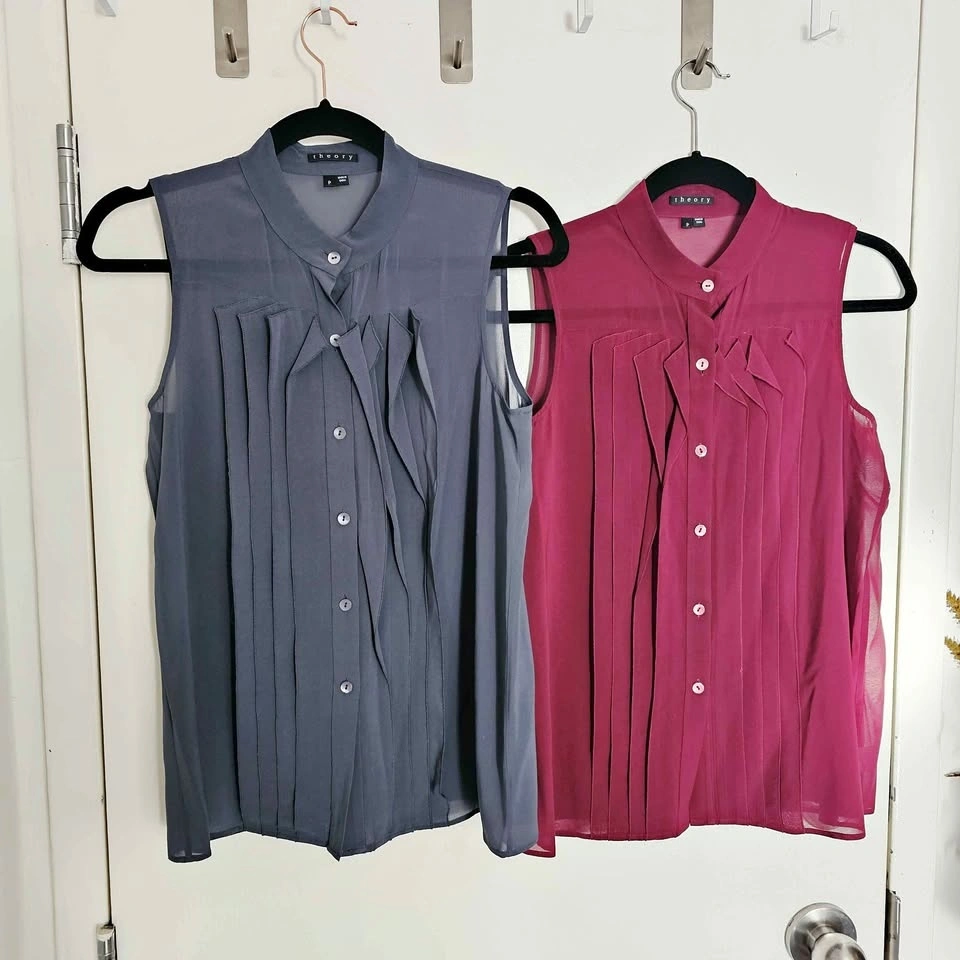 Set of 2 elegant Theory silk sleeveless blouses from luxury brand Theory, in size P (corresponds to XS). One blouse is a dark maroon/ wine purple and the other is a cool-toned slate grey. Blouses have Mandarin style round collars, pleat detailing down the front, and button up with monochromatic buttons. Made of 93% silk and 7% elastane.