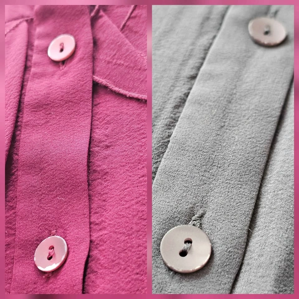 The silk material is in fantastic shape with no marks or damage. Some buttons have slight chipping of the coloring around the edges, moreso on the wine blouse than the grey one. Please see last photos for detail of the most chipped buttons.