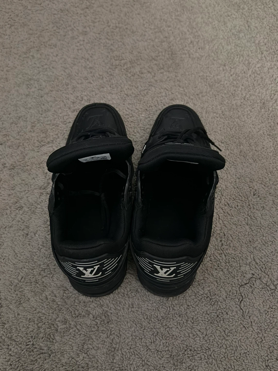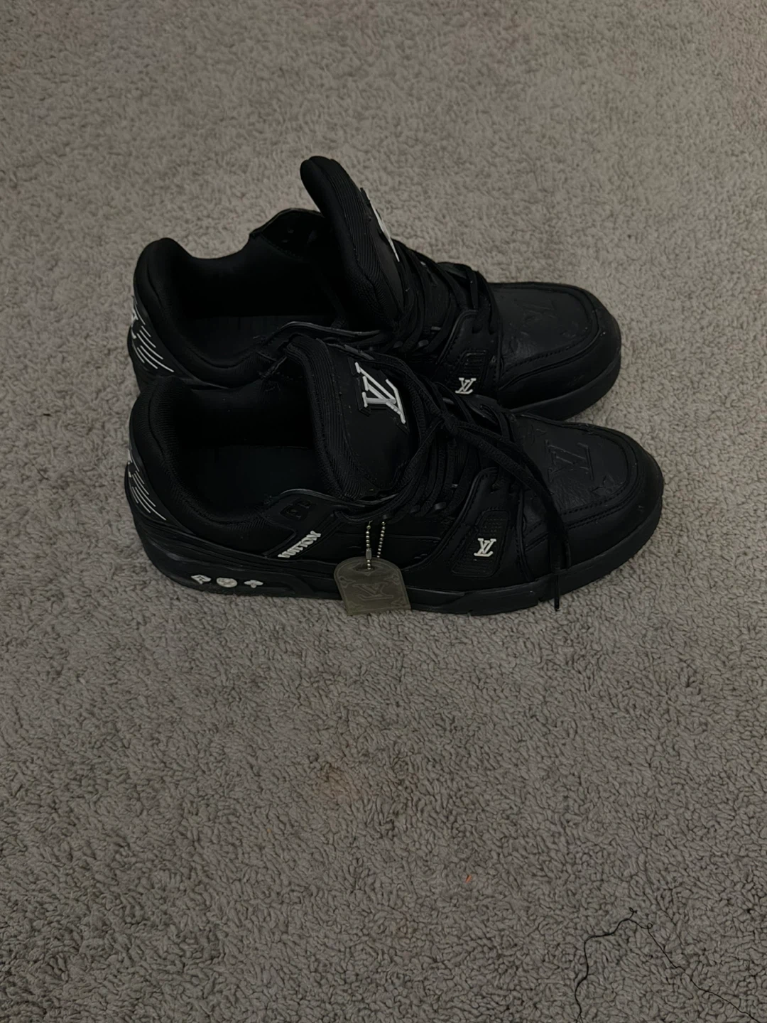 Black Louis Vuitton sneakers with monogram pattern. These stylish kicks are made of leather and feature the iconic LV logo. They're perfect for adding a touch of luxury to any outfit. Accepting cash offers no low balls