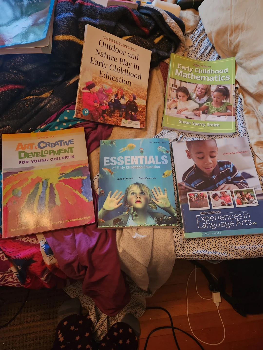 All of these textbooks are from the Sprott Shaw College ECE Basic program and some of the textbooks have highlighted markings in them.