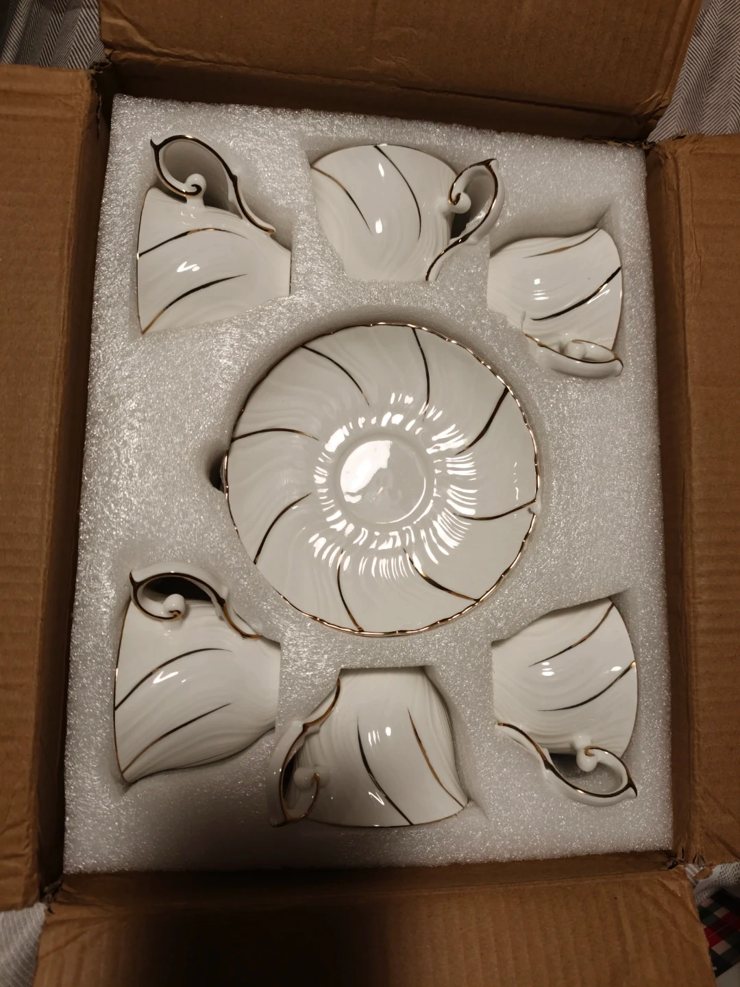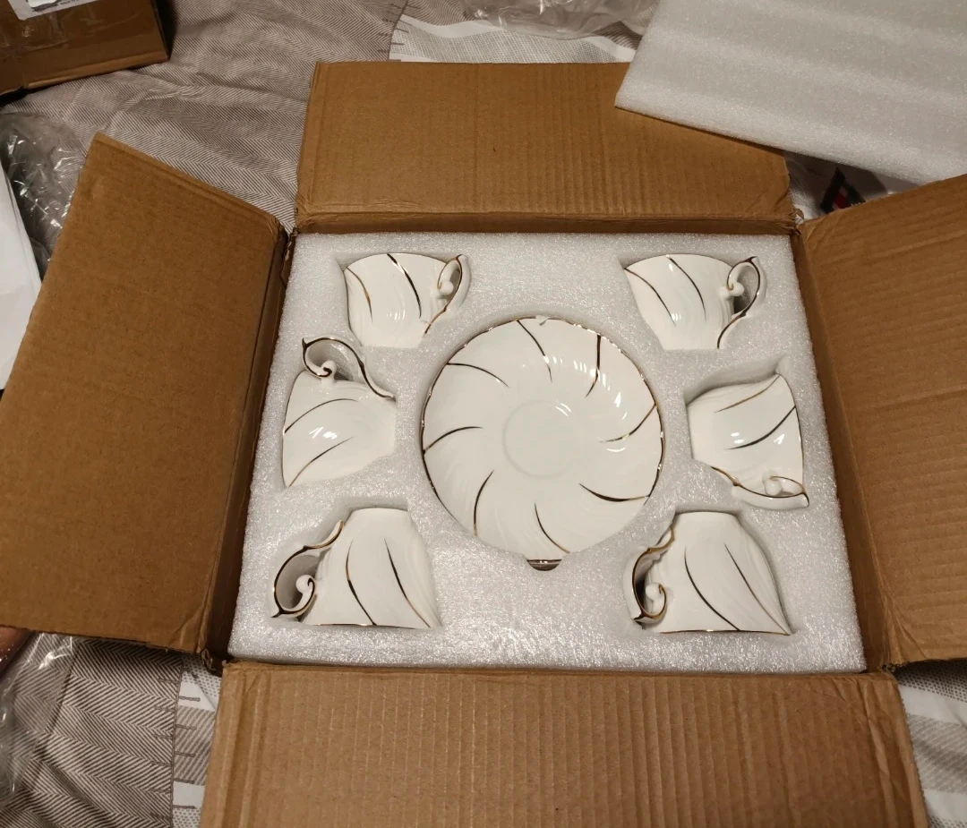 This is a set of six white porcelain coffee cups and saucers. Each piece features elegant gold trim along the rim and handle. It's a lovely set for serving coffee or tea.