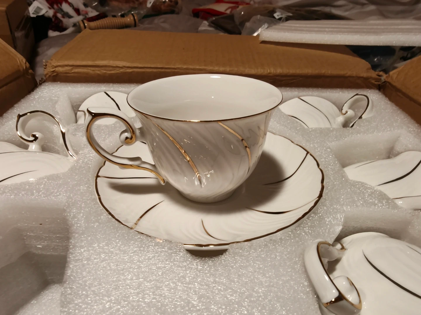 White Porcelain Coffee Cup and Saucer Set with Gold Trim