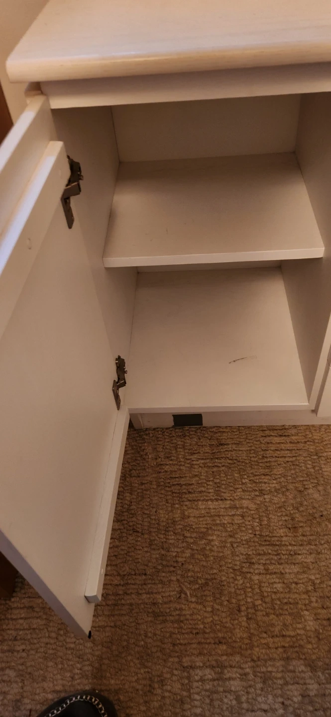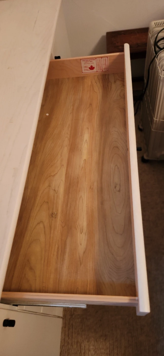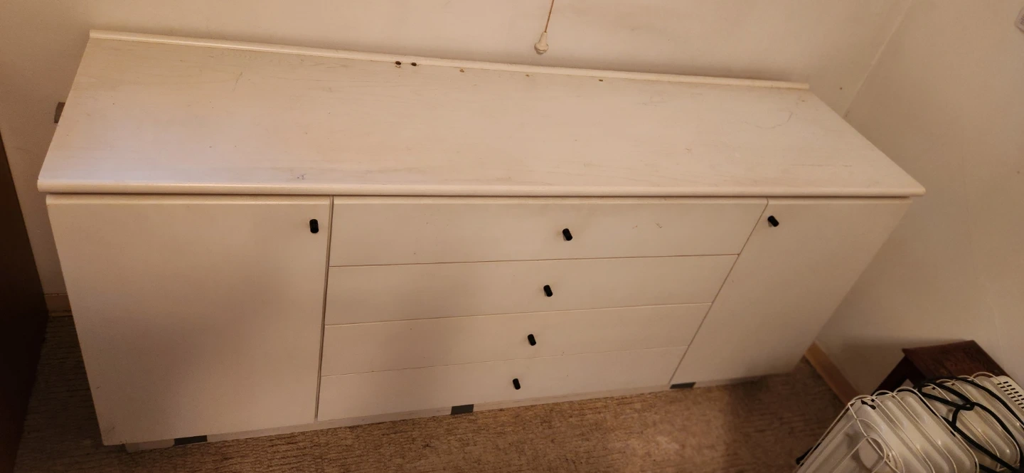 This sideboard features three drawers and two cabinet doors for ample storage. The interior is finished with natural wood. It's a clean and functional piece for any room.