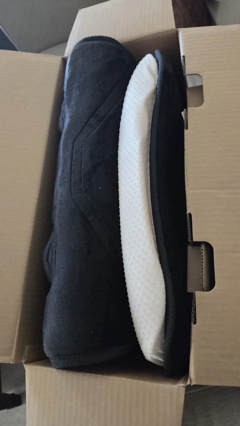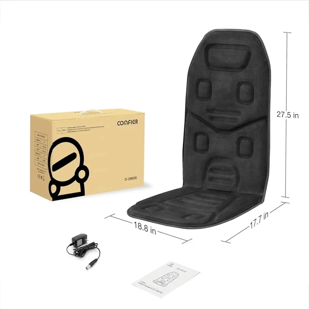 This seat cushion offers vibration massage with 10 powerful motors for neck, mid-back, lower back, and thighs/hips. It heats gradually and independently, reaching 110-150°F with 3 levels. The cushion features a 100% ultra-plush polyester surface and an anti-slip design. It's slim, easy to fold and store, and has a 30-minute auto shut-off timer for safety. This is great for relaxing at home or in the office.