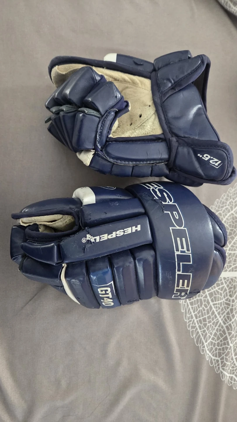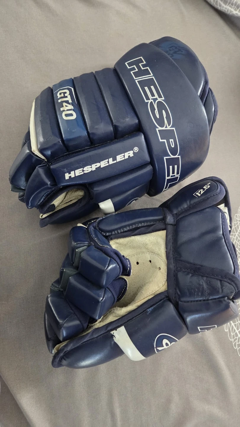 Navy blue Hespeler GT40 hockey gloves. These are a size 12.5 inch. They're made for hockey protection. Great for players looking for reliable hand gear.