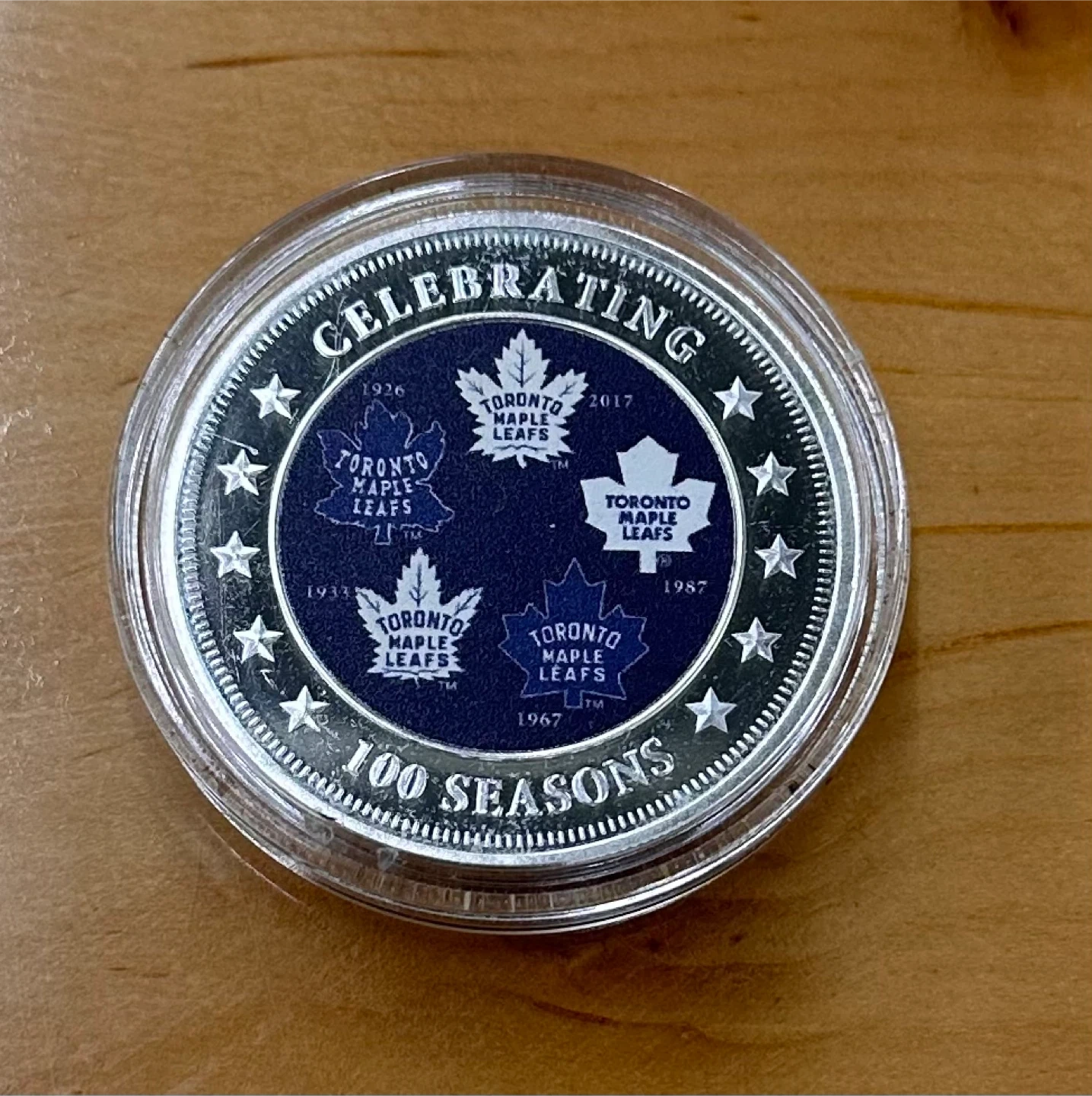 This coin celebrates the 100th anniversary of the Toronto Maple Leafs. It features various logos from different years. Minted 2017.