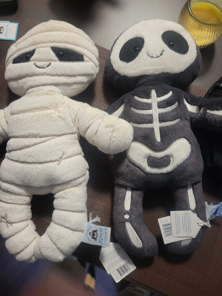 Two adorable Jellycat plush toys, one mummy and one skeleton. These soft toys are perfect for Halloween or any time of year! They are made of plush material.