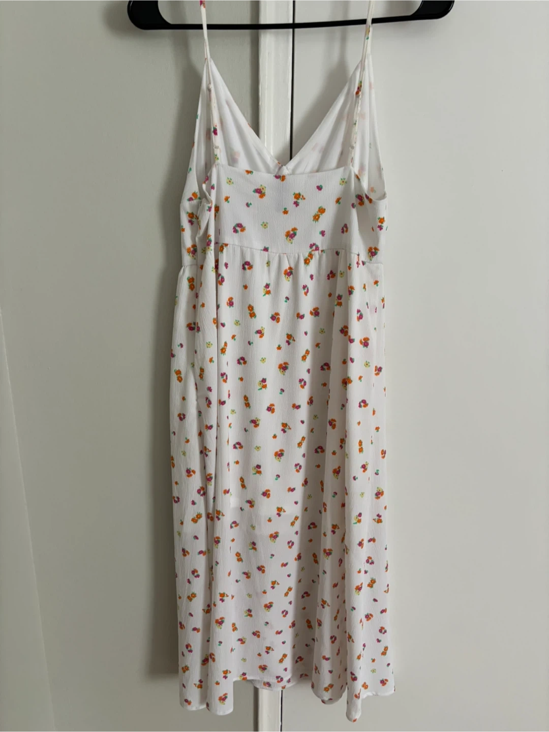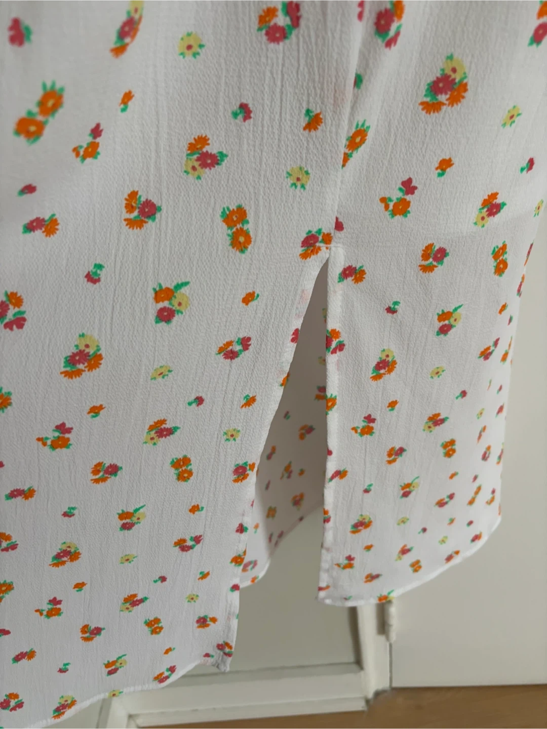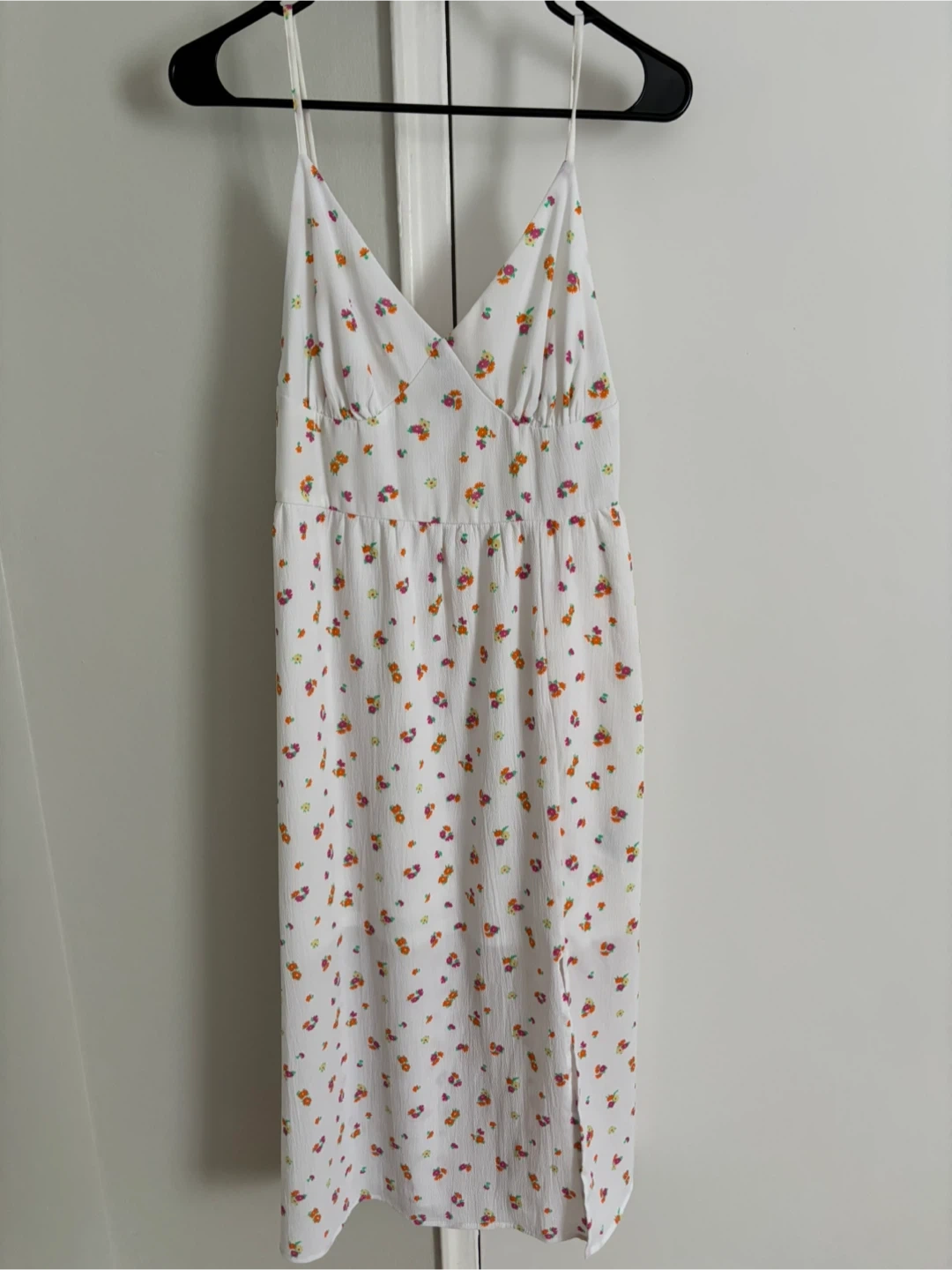 White sundress with a colourful floral print in great condition.Features a V-neck and a side slit. Size L
