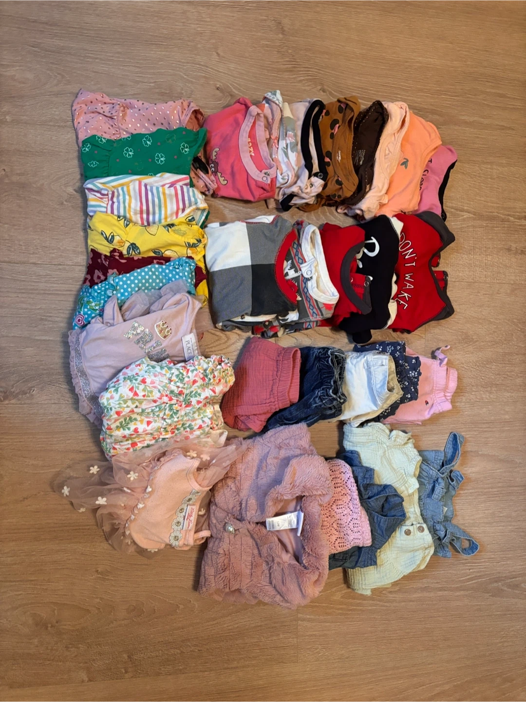 A collection of assorted girls' baby clothes. Includes various onesies, tops, and dresses. In sizes newborn to 24 months. 👚🌸