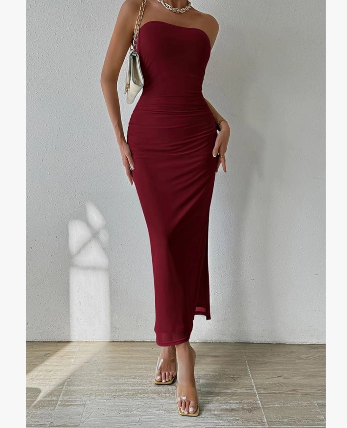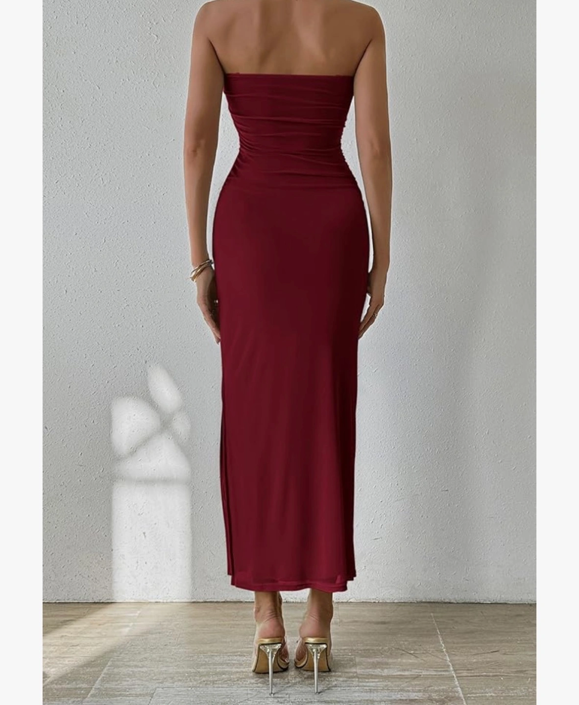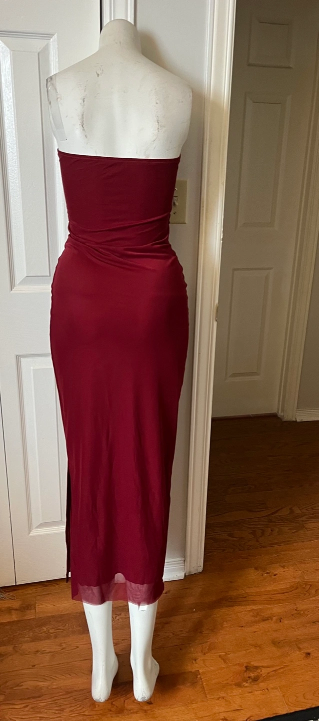 Pretty garden small size dress.This maroon strapless maxi dress features a flattering ruched detail. It's made of a stretchy material that hugs your curves. The dress has a thigh-high slit for added flair.