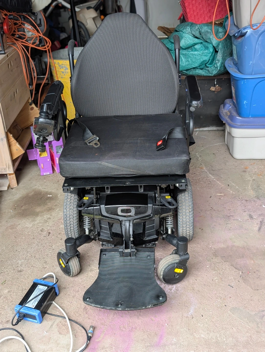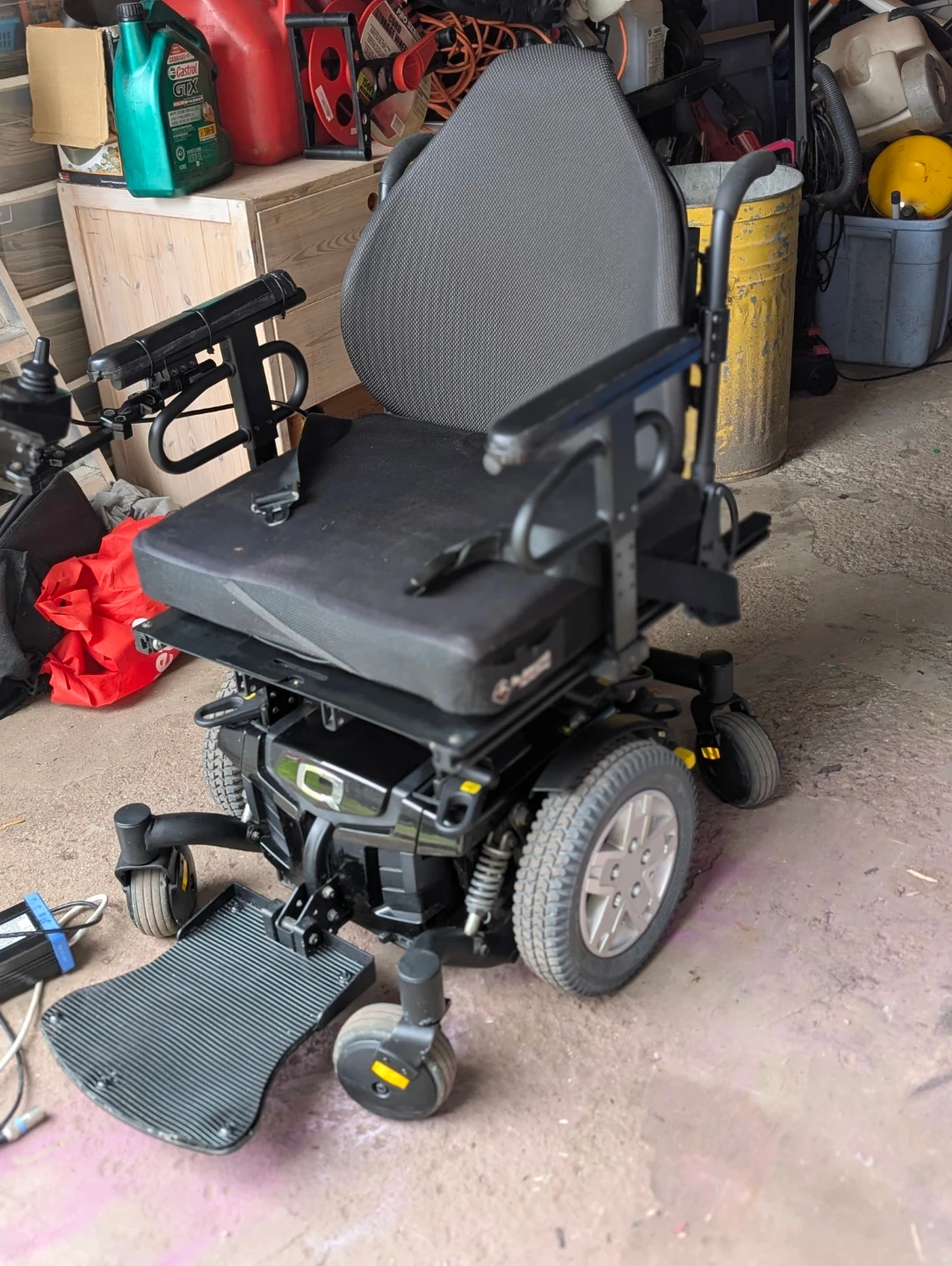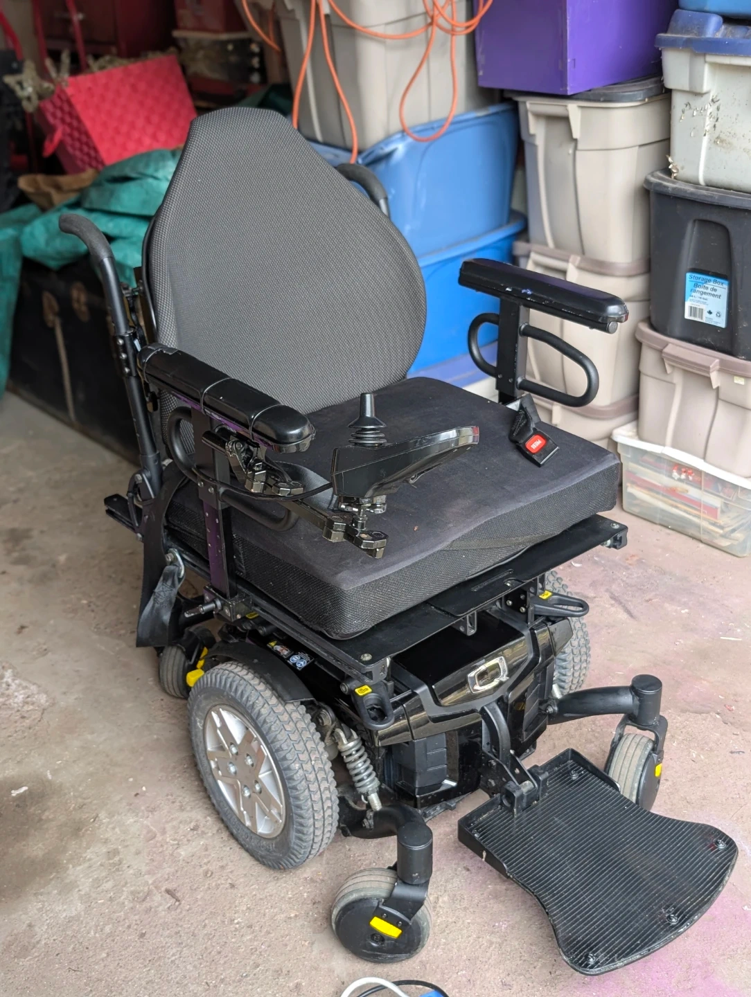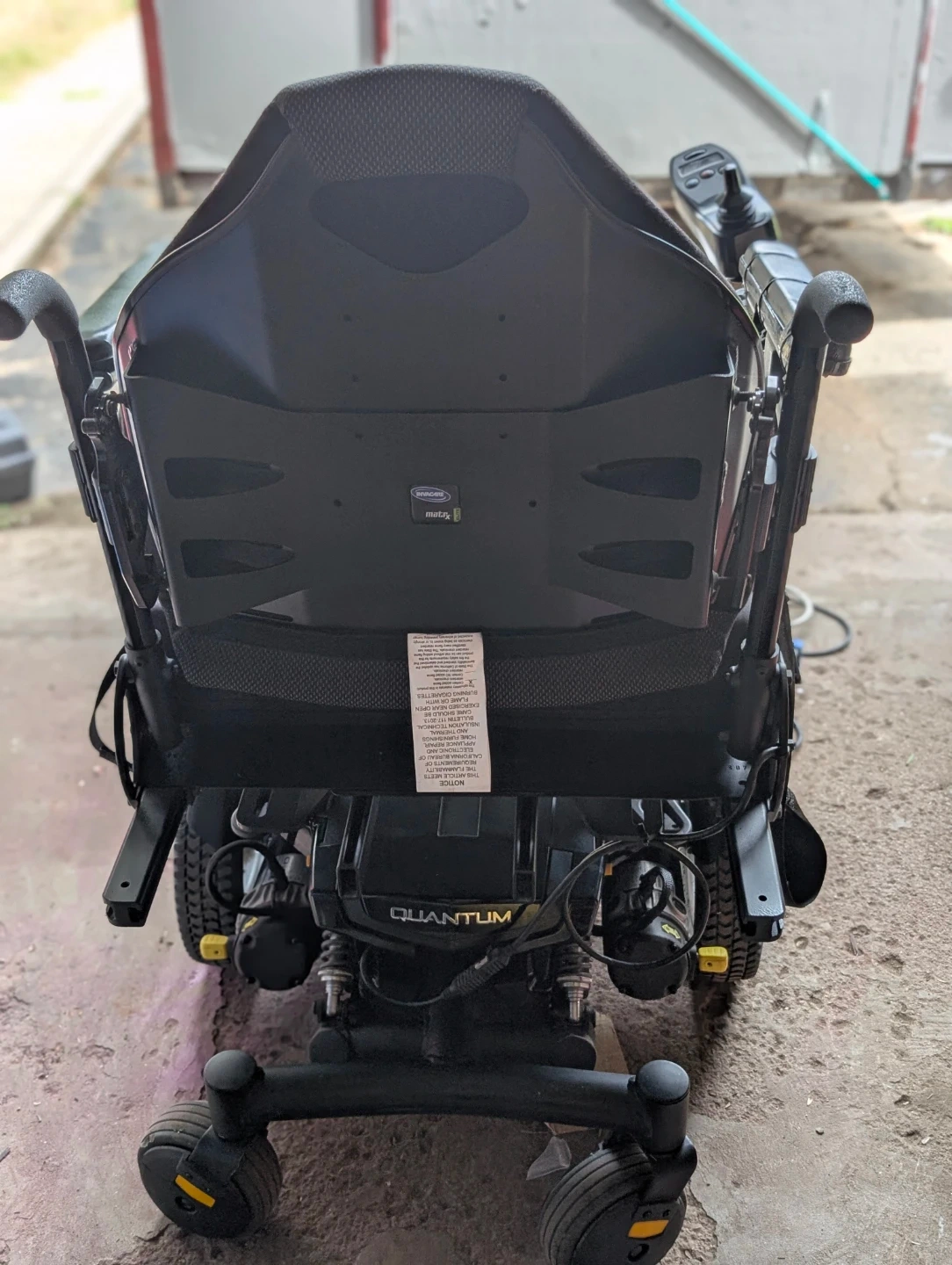 This is a Quantum power wheelchair. It features a comfortable, adjustable seat and a joystick for easy control. The sturdy design ensures reliable mobility. It's a great option for anyone needing assistance with getting around!
