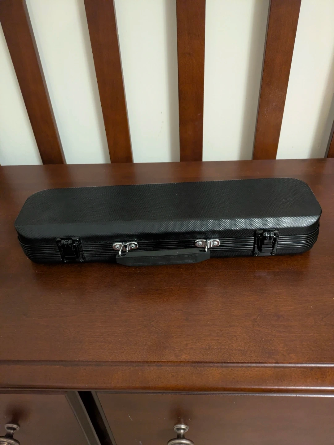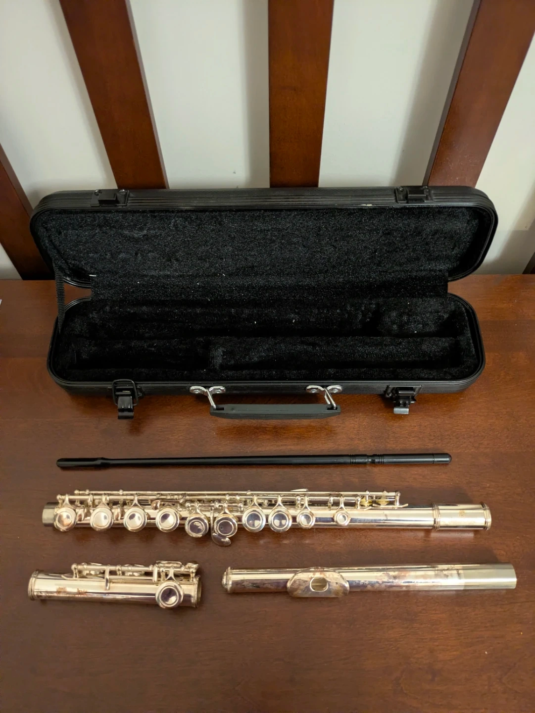 This is a silver flute, likely for a beginner or student. It's in a protective original hard case. It shows some signs of tarnishing but appears to be functional. Includes cleaning rod.