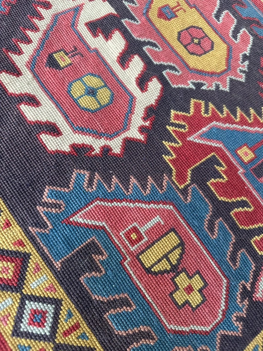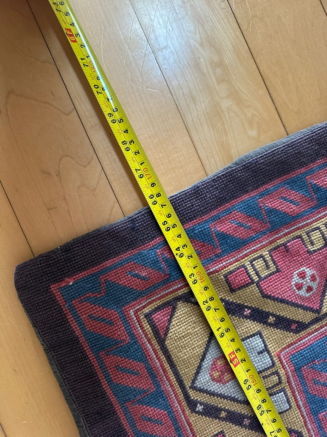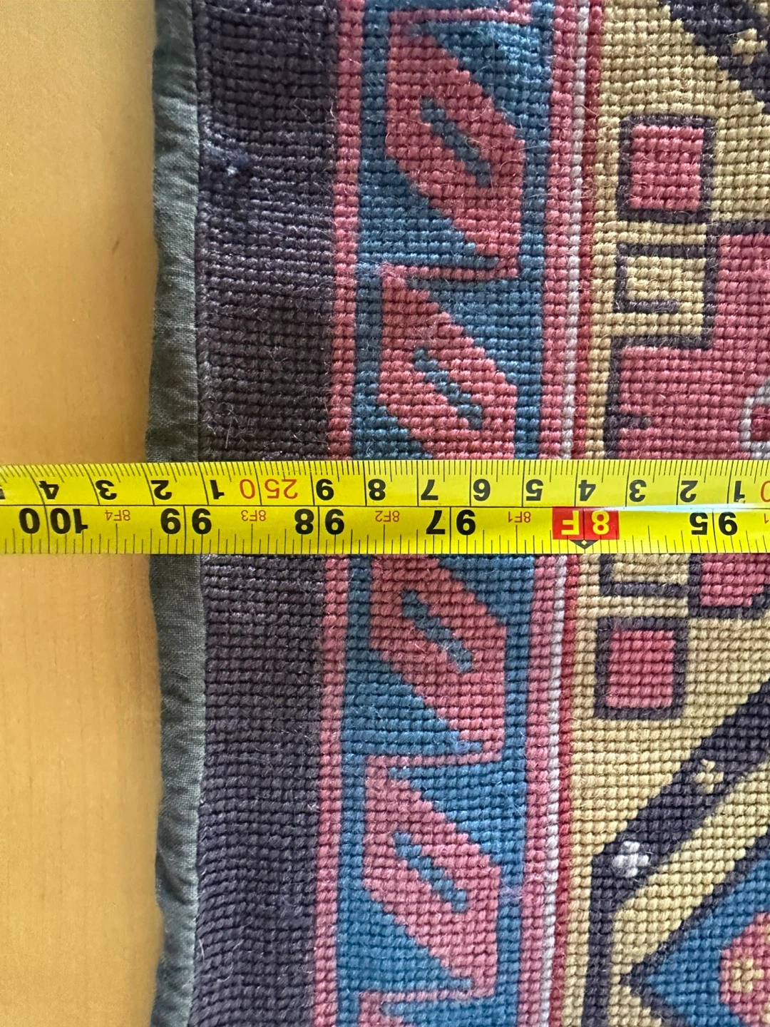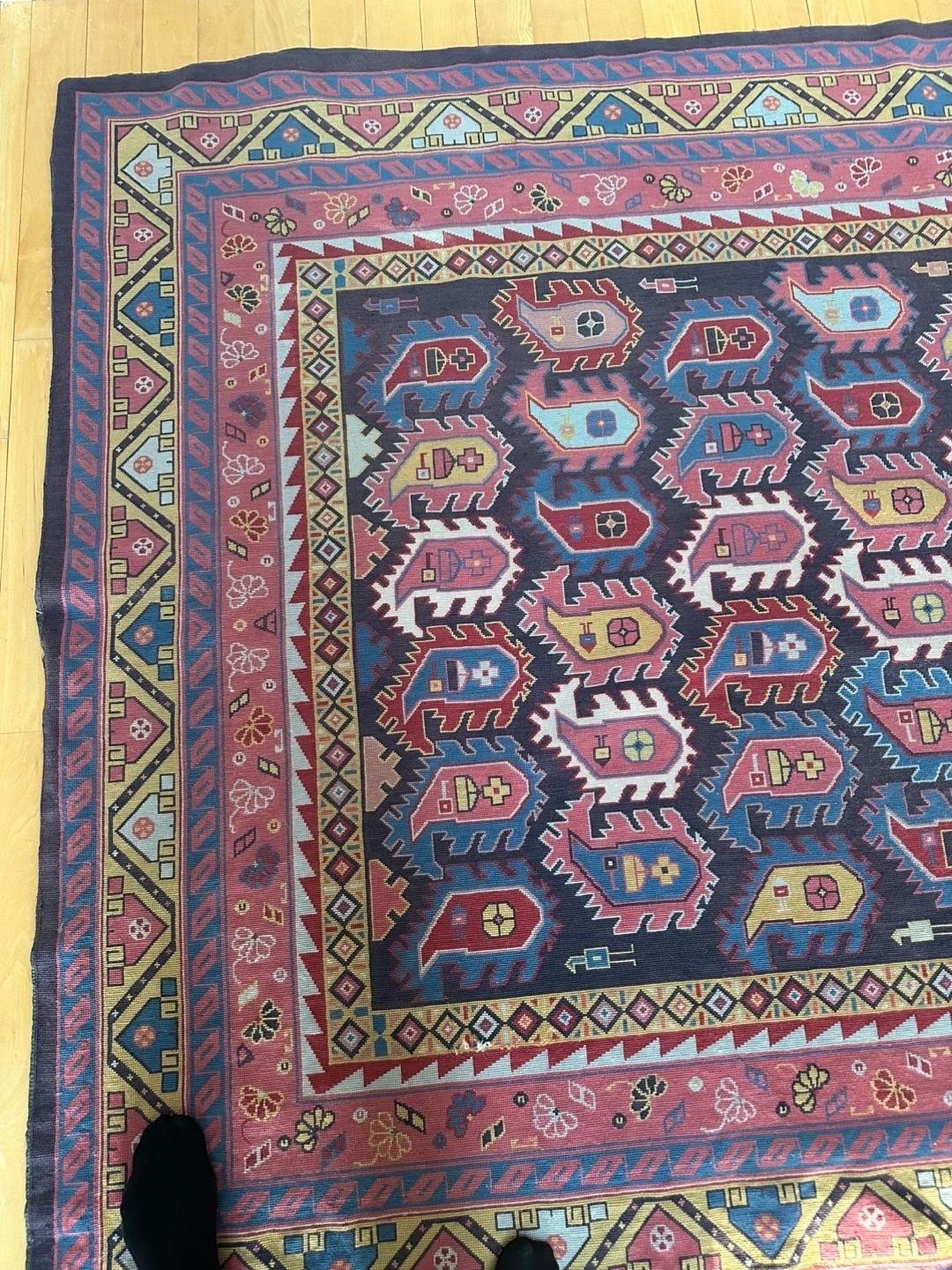 A Antique Turkish rug with a striking geometric pattern in shades of deep blue, pink, and yellow. Measurements are approximately 8x5 ft