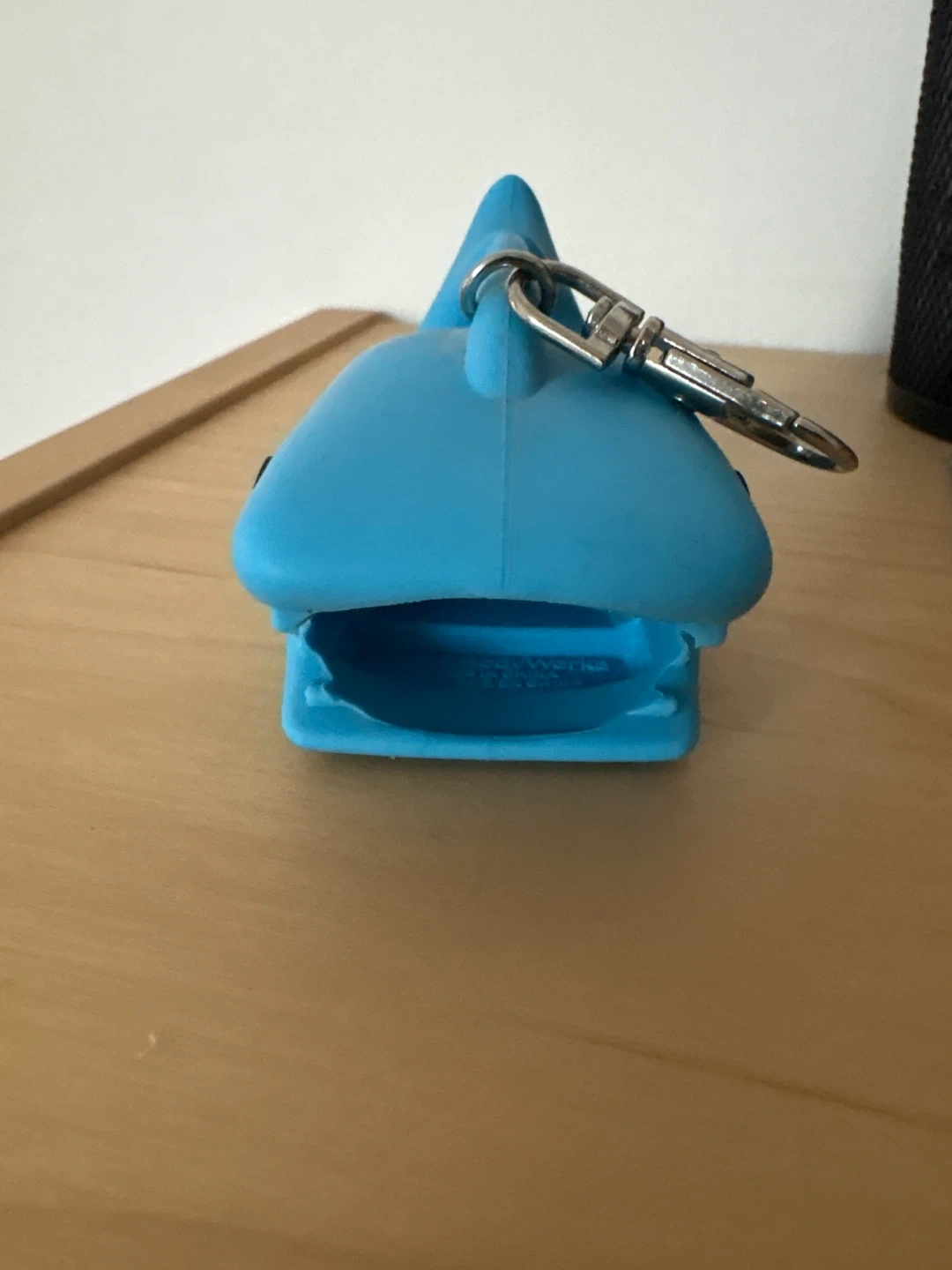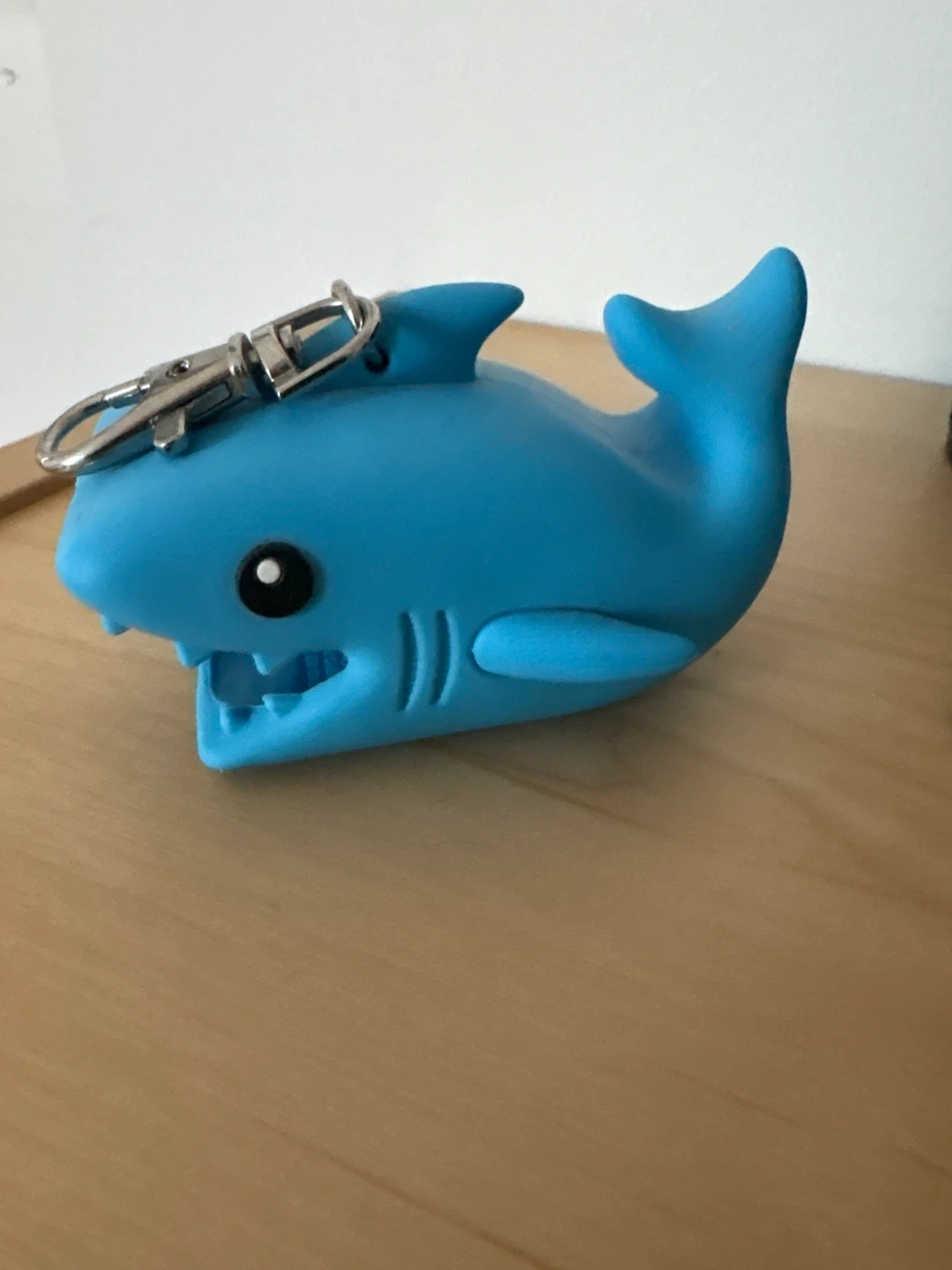 This is a blue shark-shaped keychain holder. It's made of a flexible material and has a clip for attaching to bags or belts. It's perfect for keeping small items like lip balm or hand sanitizer secure and accessible!