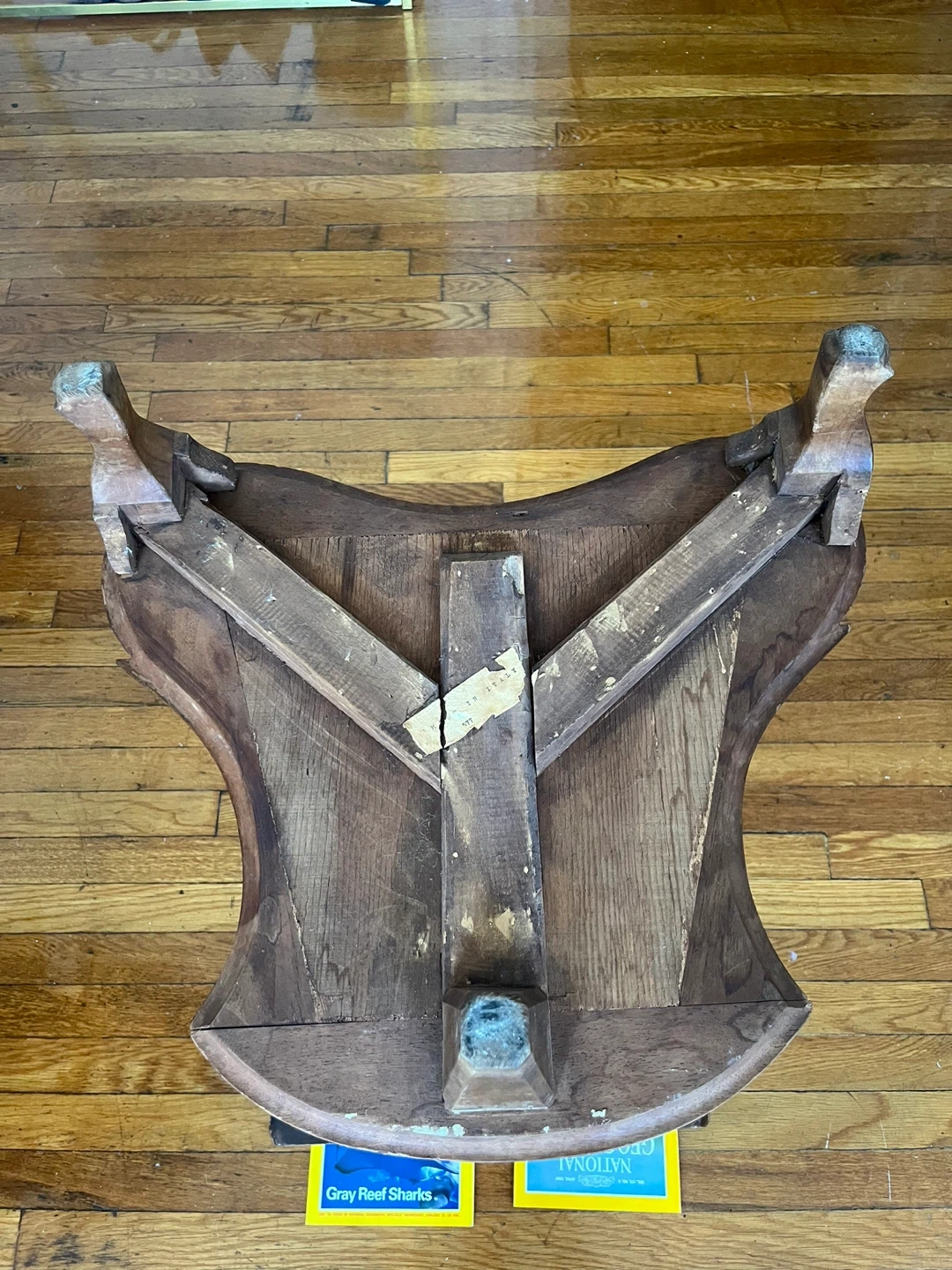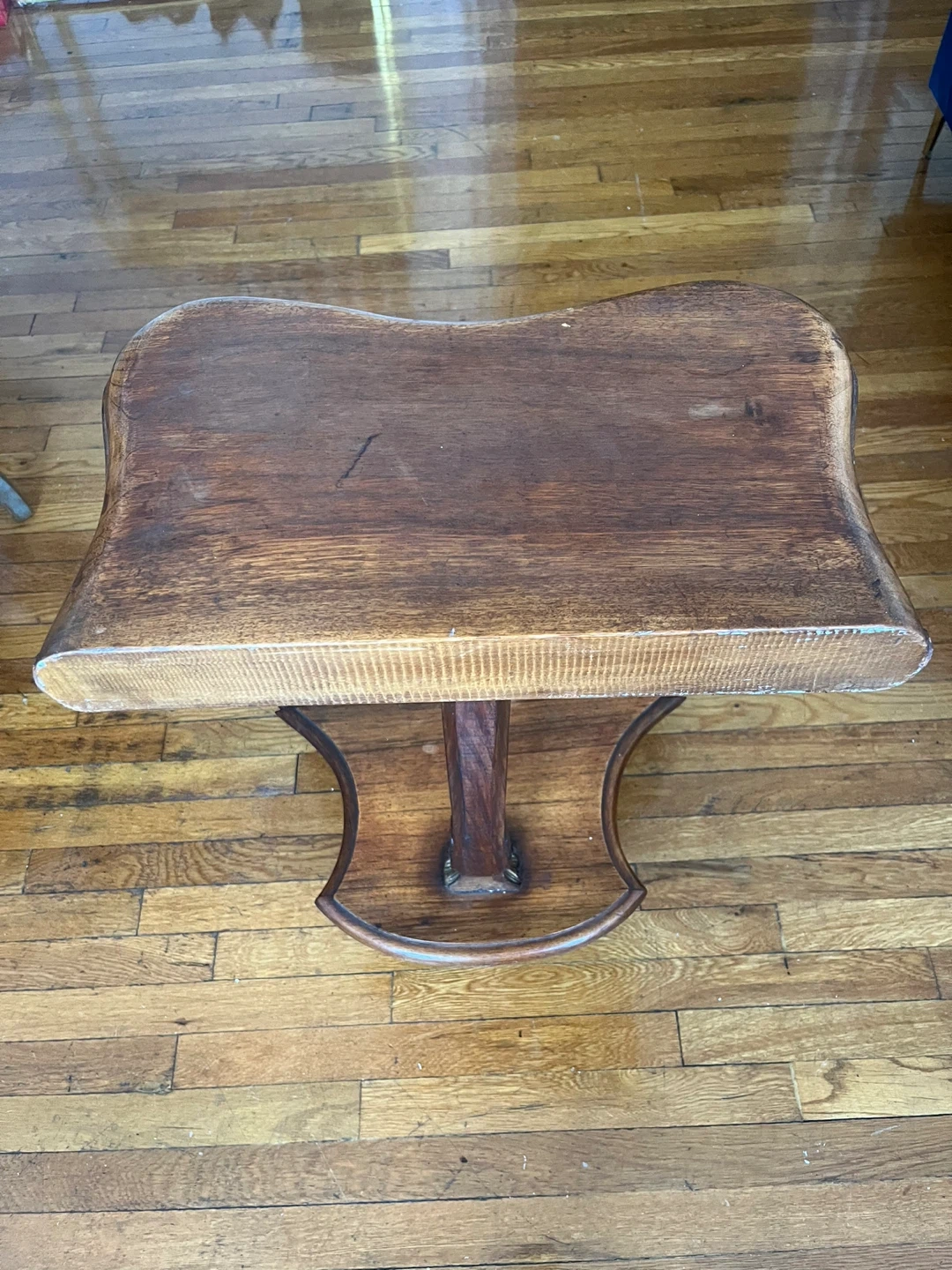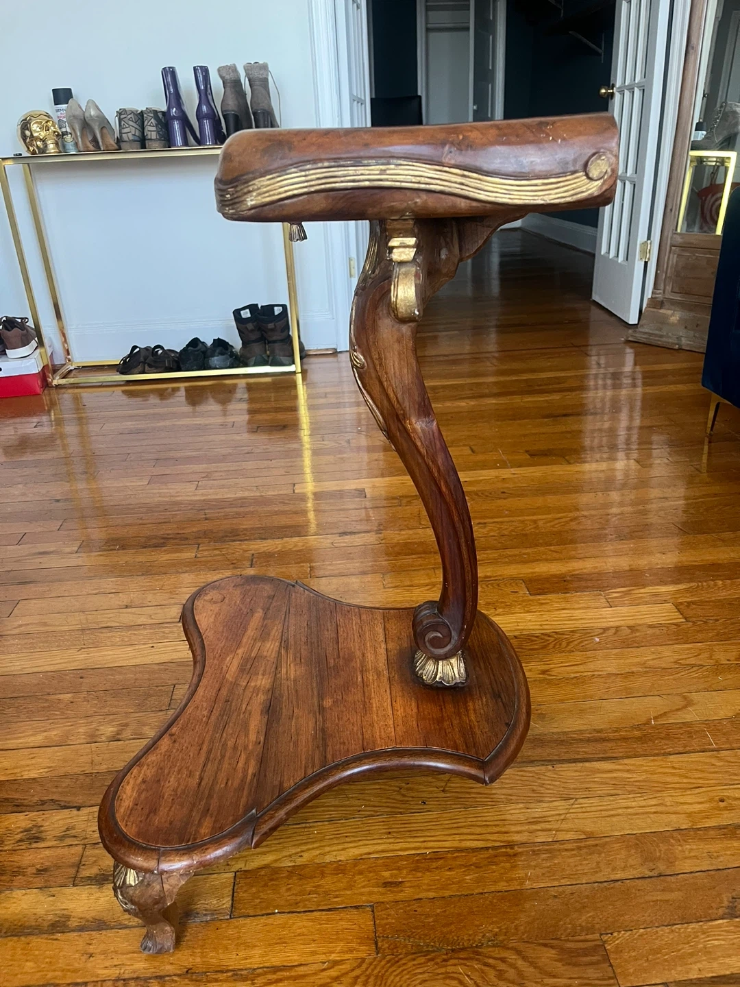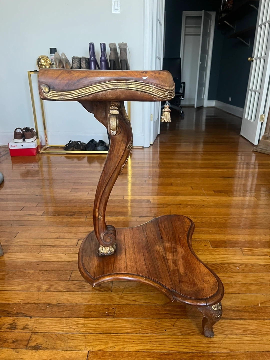 This vintage pedestal stand is crafted from wood with ornate carved details and gold accents. Its unique curved base and top add a decorative touch. It's perfect for displaying plants or decorative items or praying. Lol. My father is a woodworker. He didn’t make this, but he loves collecting beautiful things. He gave it to me, but I have no use for it. One of the tassels is missing and there is some water stains, but it is quite lovely to look at.