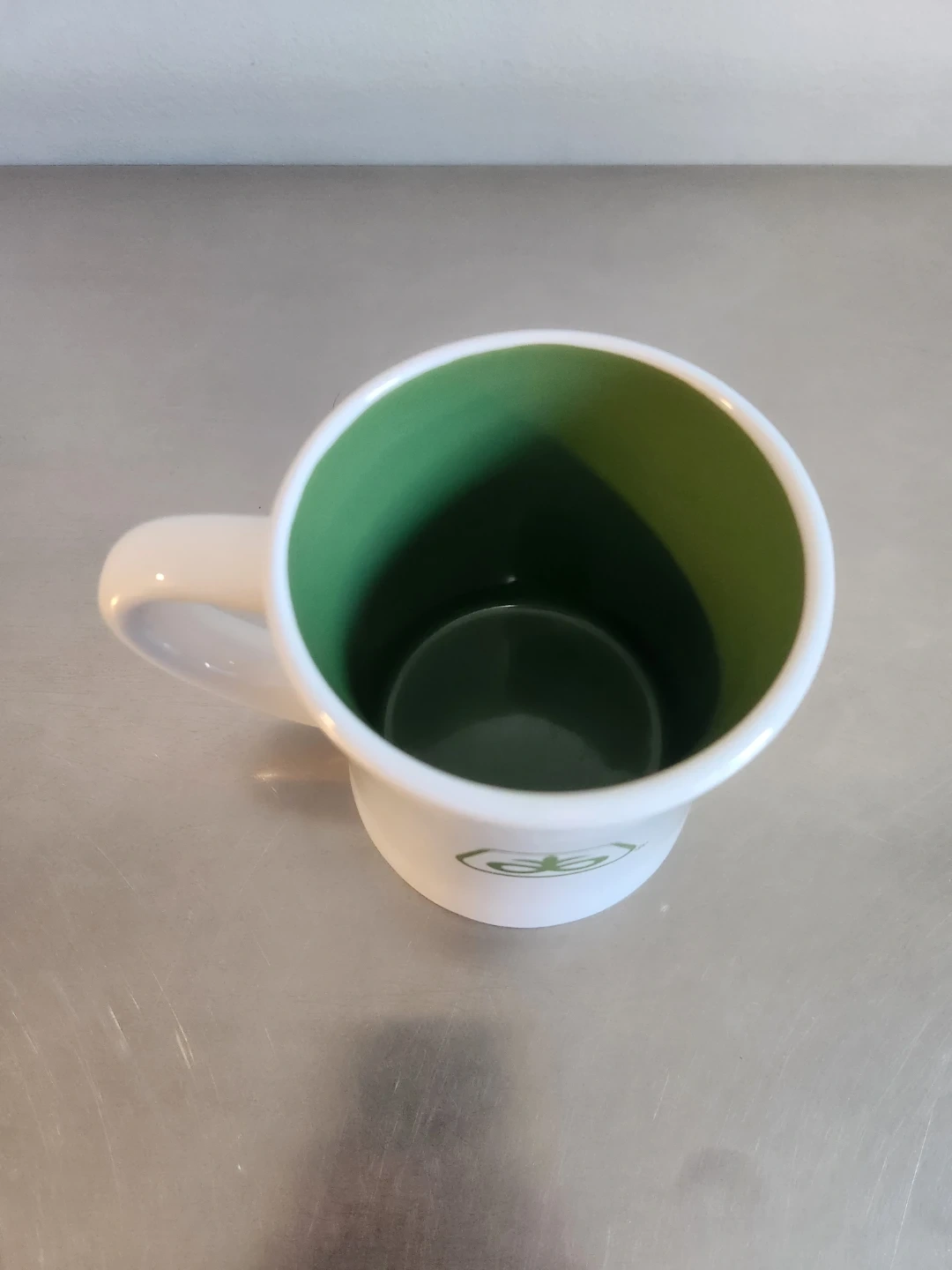 White ceramic coffee mug with a green interior. Features the DuPont logo and a Pioneer Hi-Bred logo. It's a sturdy mug for your favourite beverage!