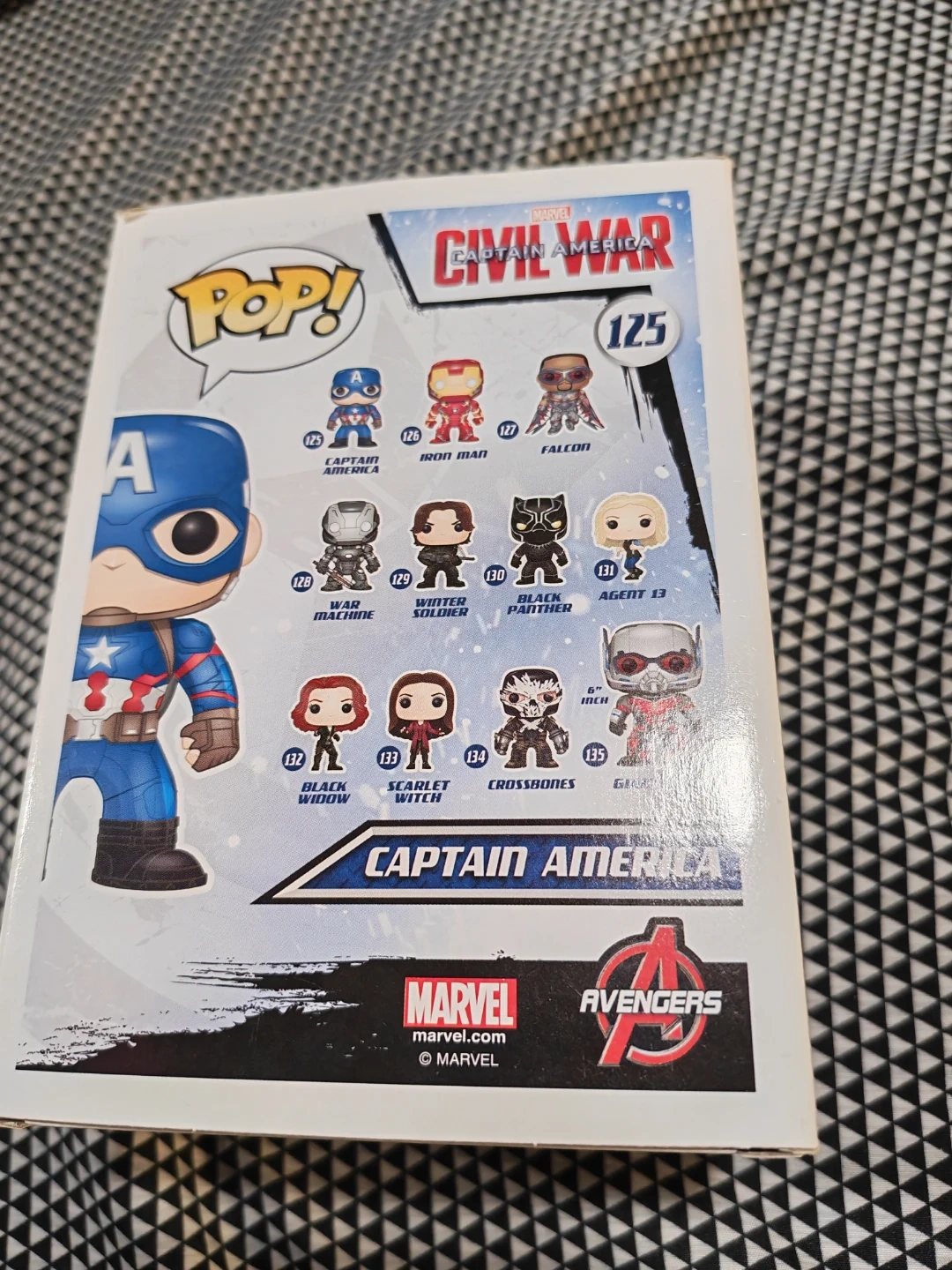 This is a Funko Pop! Vinyl Bobble-Head figure of Captain America from the Marvel Civil War collection, number 125. It's recommended for ages 3 and up. The figure comes in its original packaging.