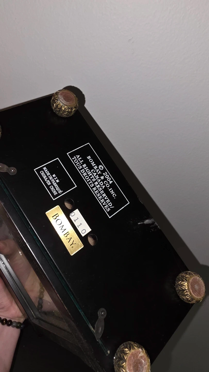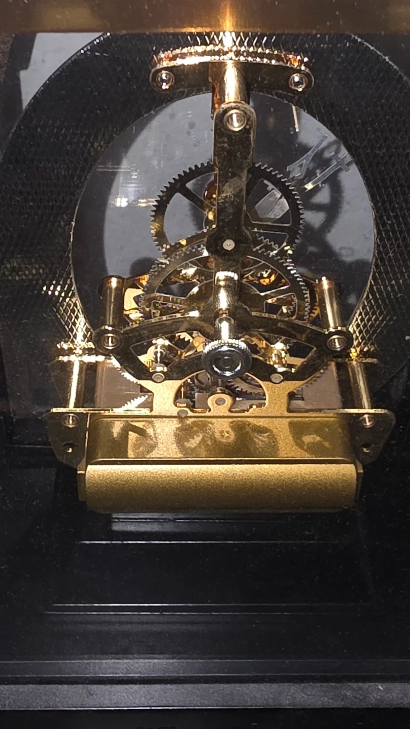 This Bombay mantel clock features a visible brass movement and a black wood case. It's a decorative piece for any shelf or mantle. A great accent for a living room or study!