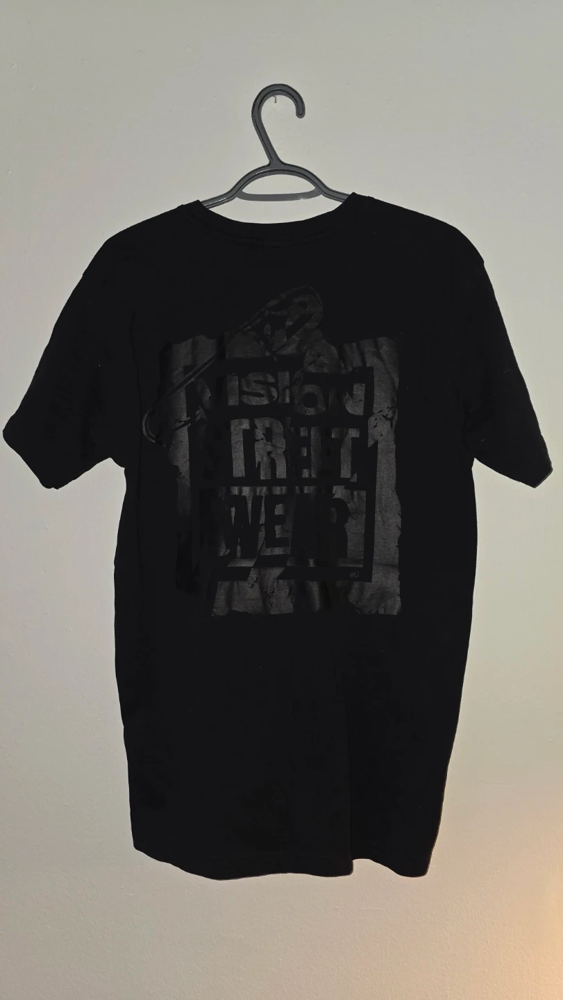 This is a black Vision Street Wear t-shirt. It's a size medium with the brand's logo printed on the front and back. Made from cotton material.