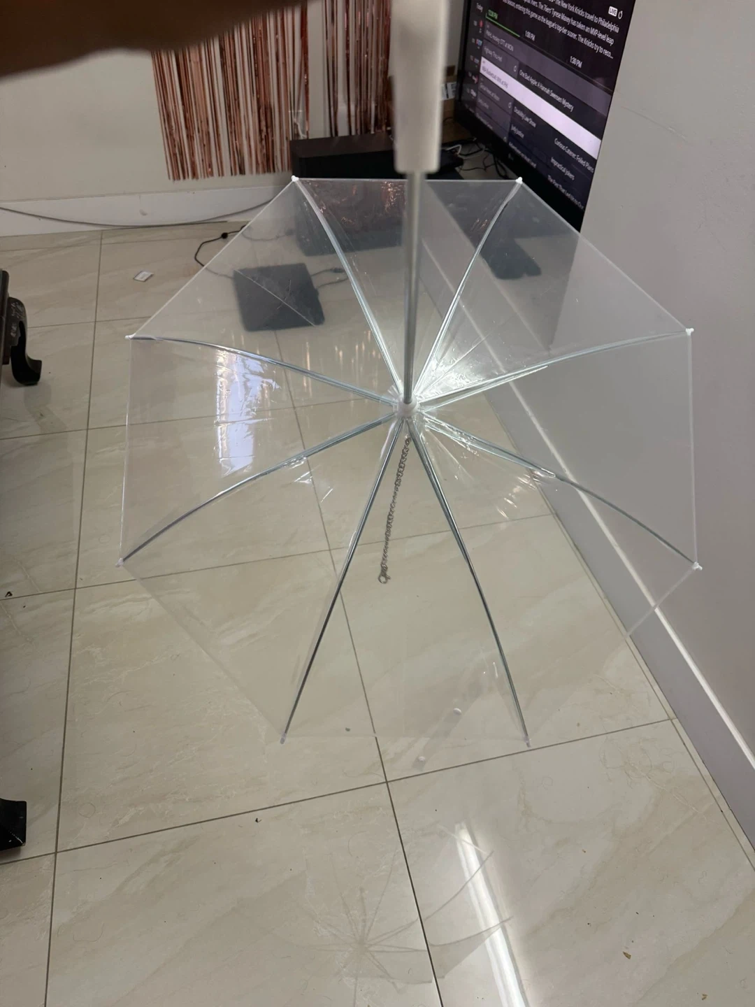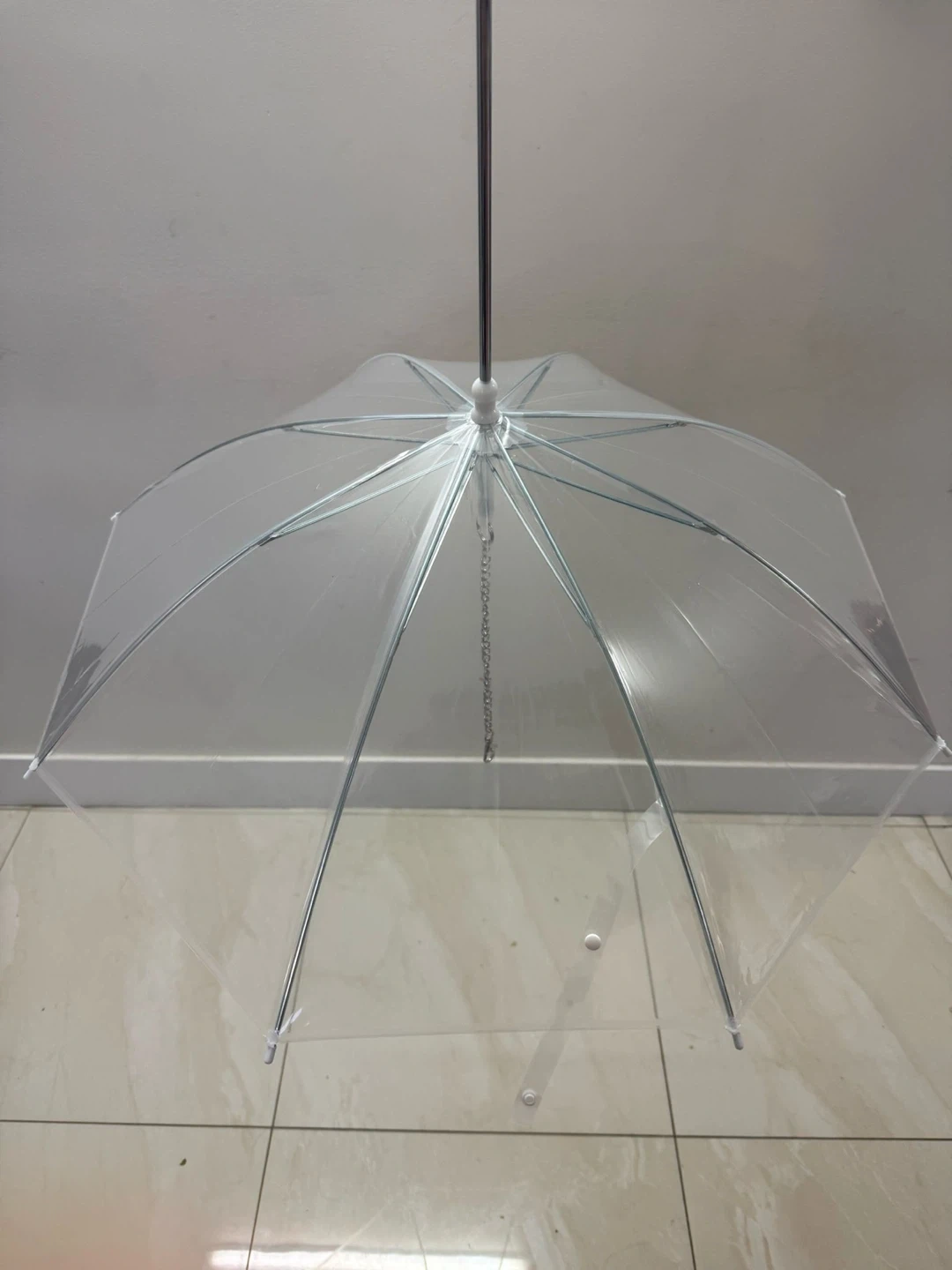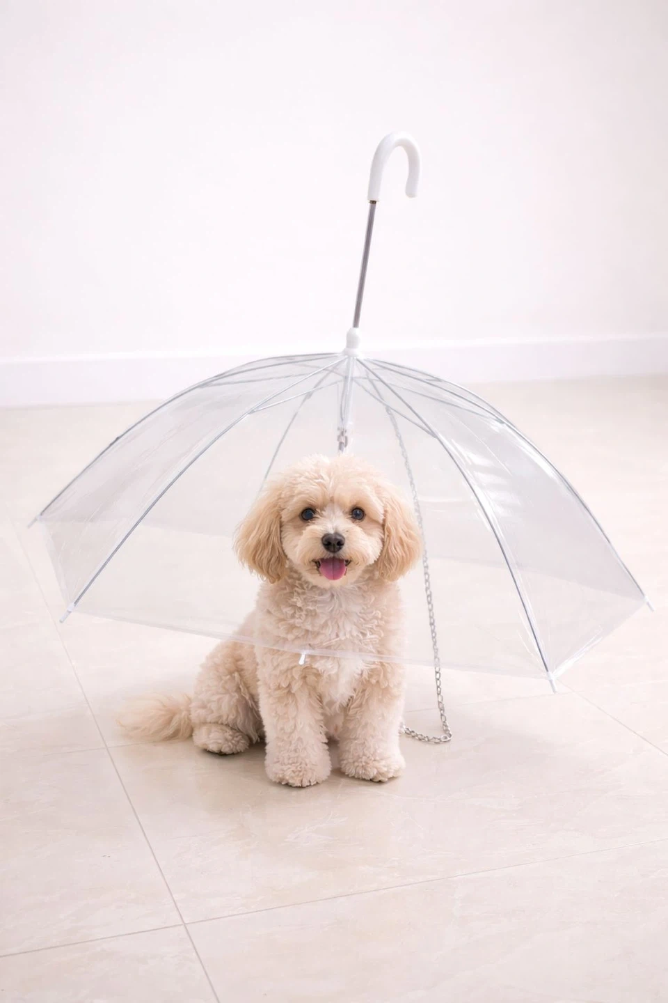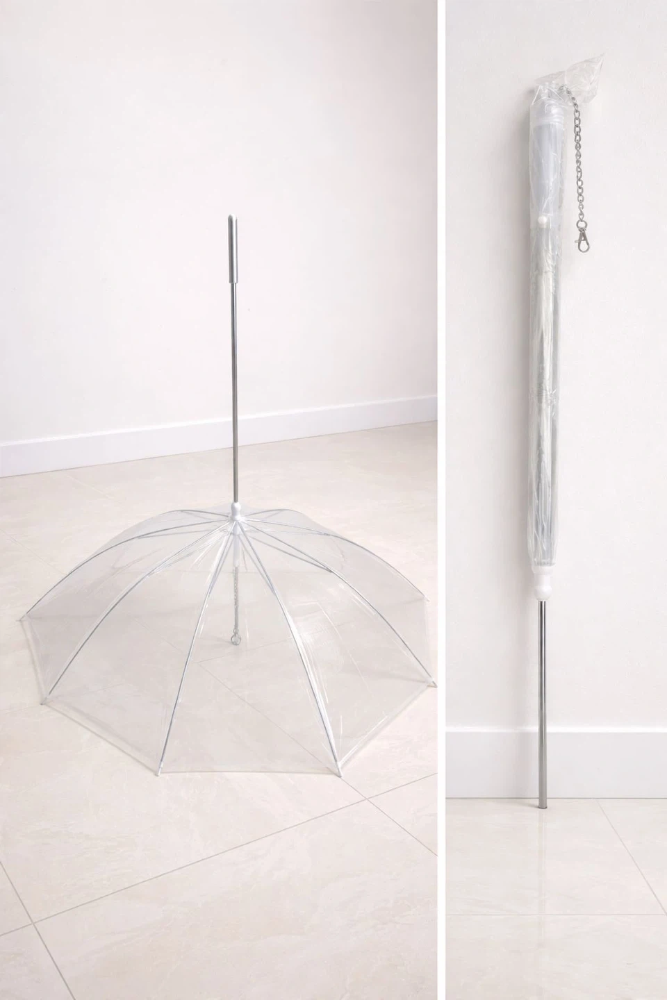 Keep your furry friend dry with this handy clear dome umbrella. It features a convenient leash clip and a sturdy metal shaft. Ideal for walks in the rain!