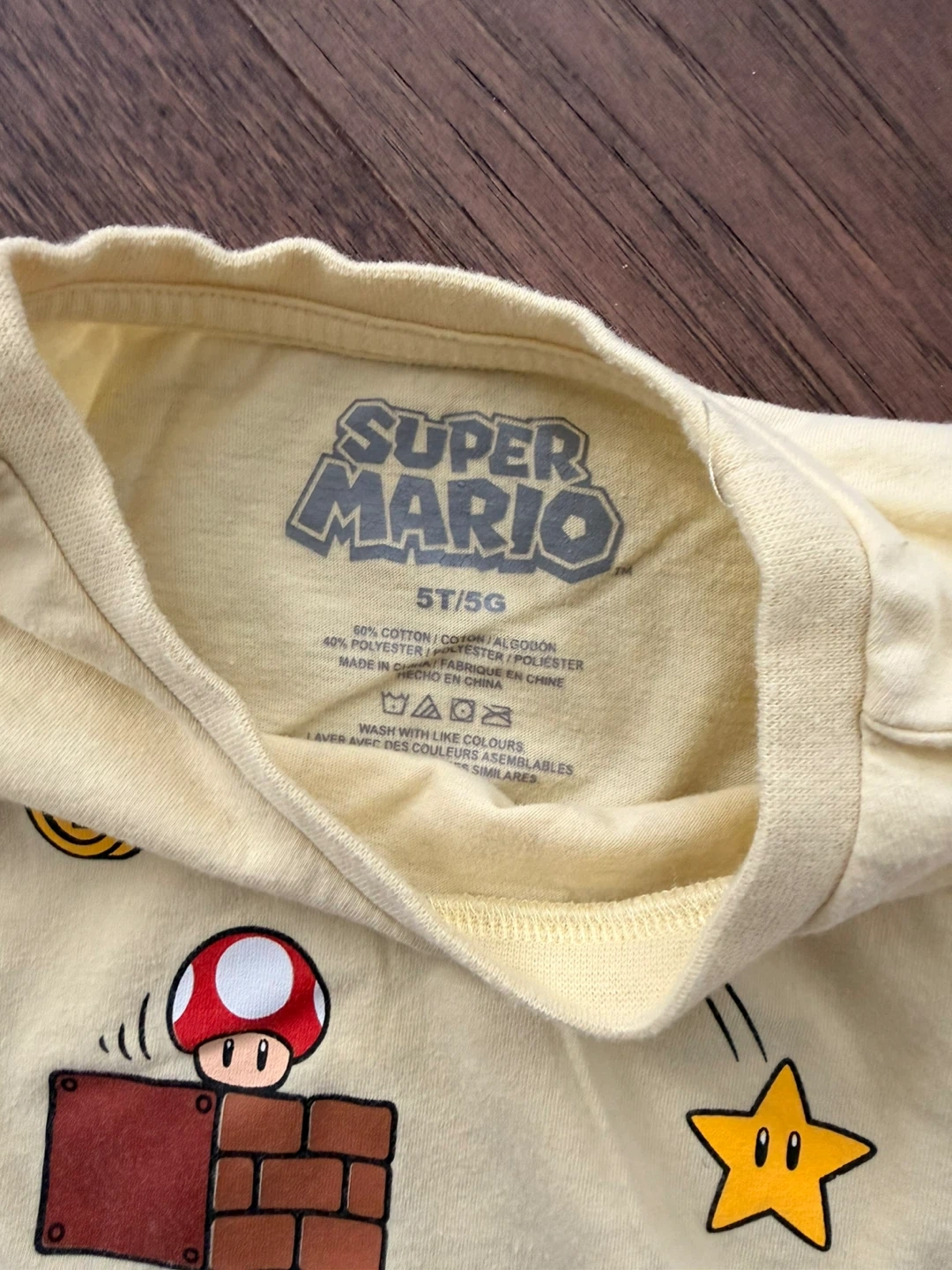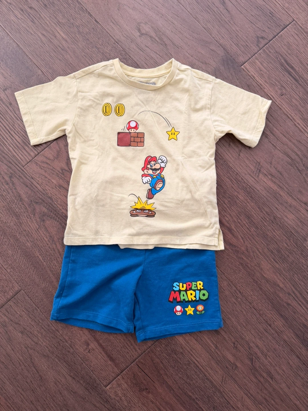 A Super Mario themed tshirt and short set. The top is yellow with Mario graphics and the bottoms are blue with "Super Mario” (size Kids' sizes 5T.