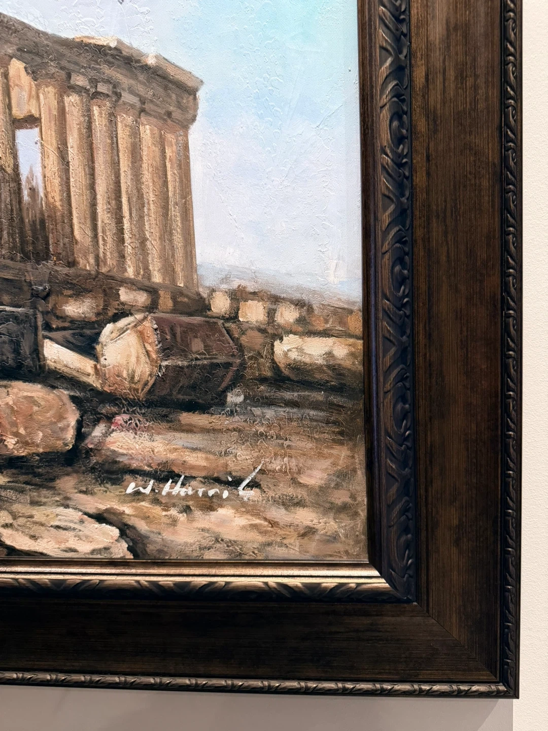 This is a framed painting depicting the ancient Parthenon. The artwork is signed by the artist. It features a beautiful rendition of the iconic Greek structure against a bright blue sky.