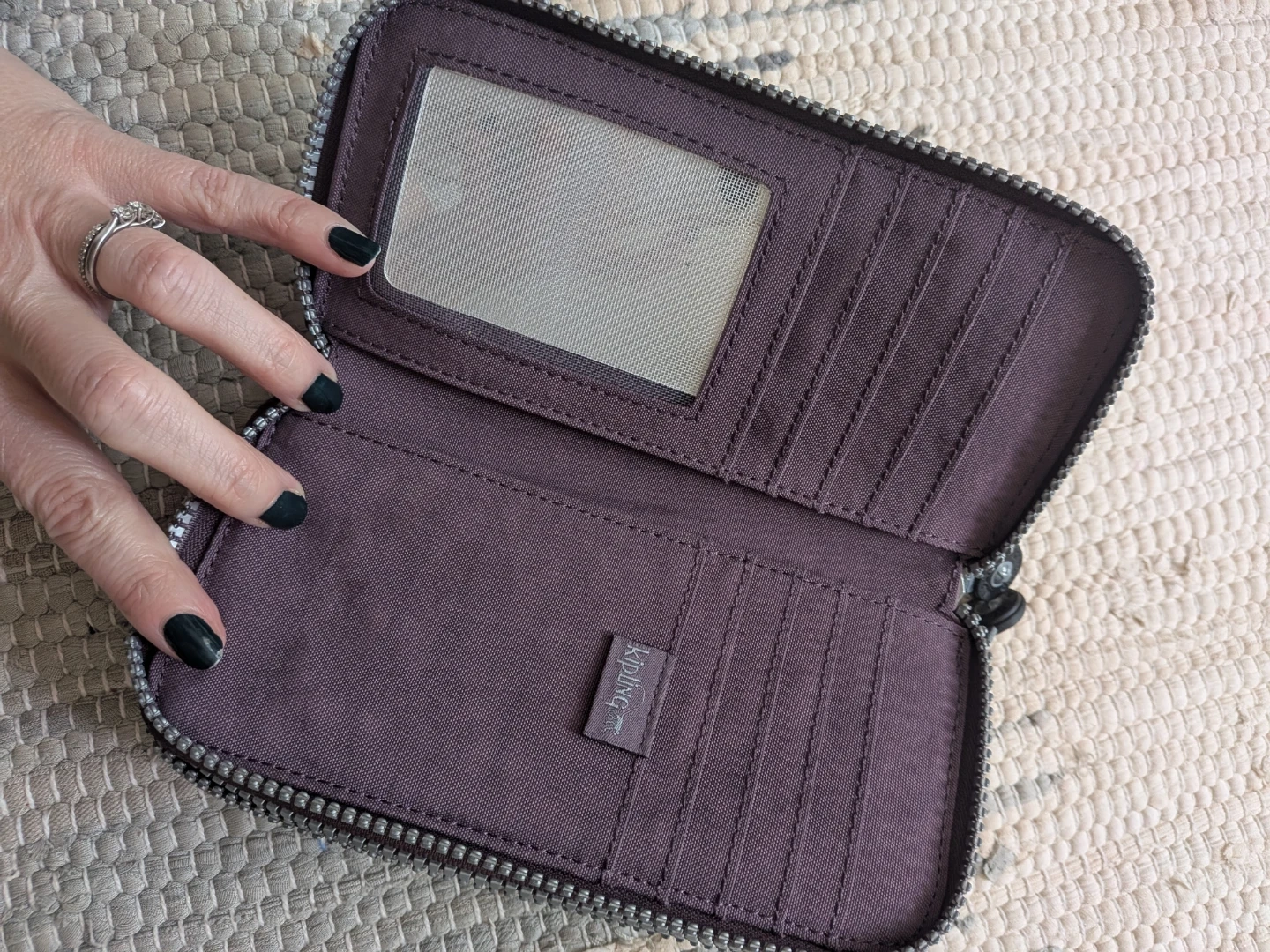 This is a Kipling zip-around wallet in a lovely shade of purple. It features multiple card slots, a clear ID window, and a zippered coin pocket inside. The durable nylon construction ensures it's built to last!