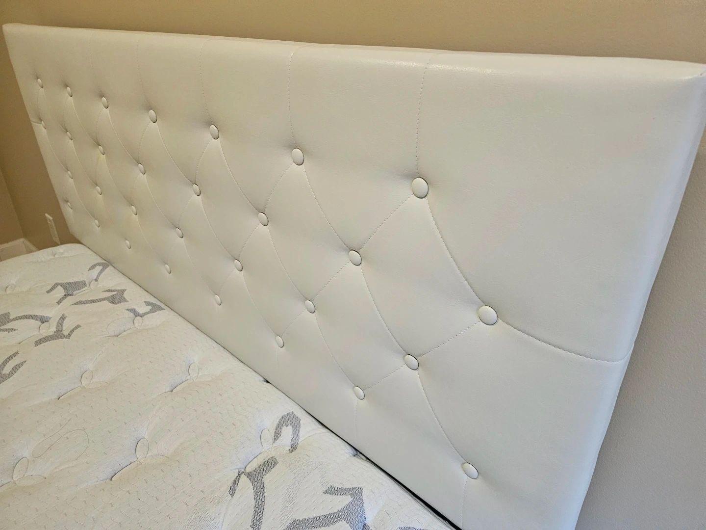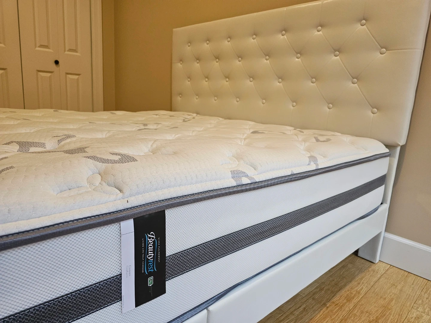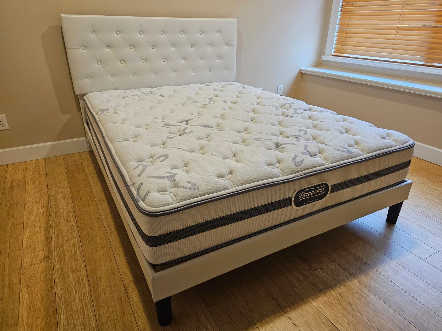 Selling a set of duble size leather bed frame and Beautyrest Recharge mattress. It features a quilted top with a grey pattern. The side panel is a textured grey and white fabric. Very clean and like new condition.