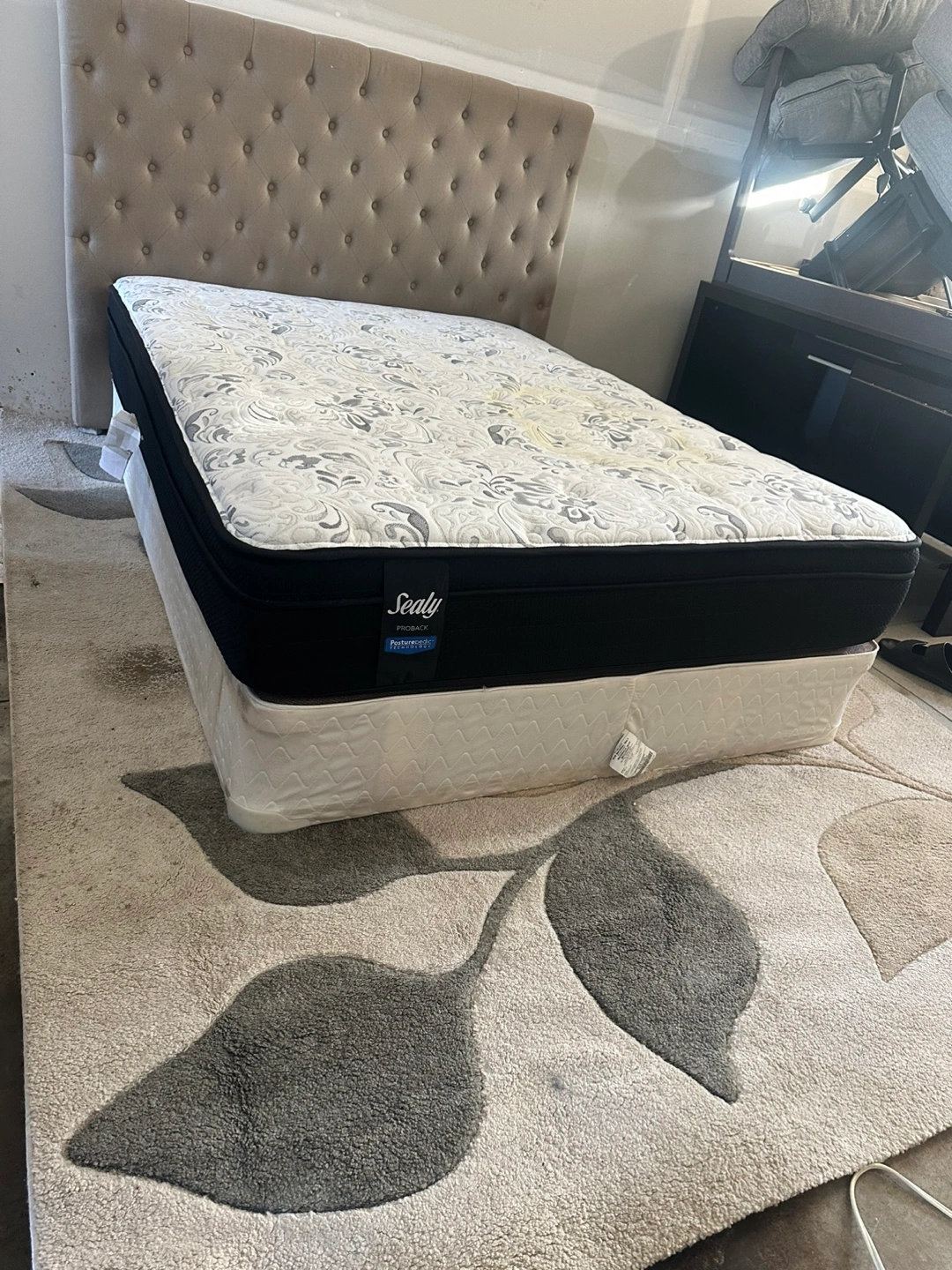 Selling a full queen-size bed set that includes a mattress, headboard, and box spring. Everything is in excellent, perfect condition and has been well cared for, only a little stain on the mattress but overall in a good condition.