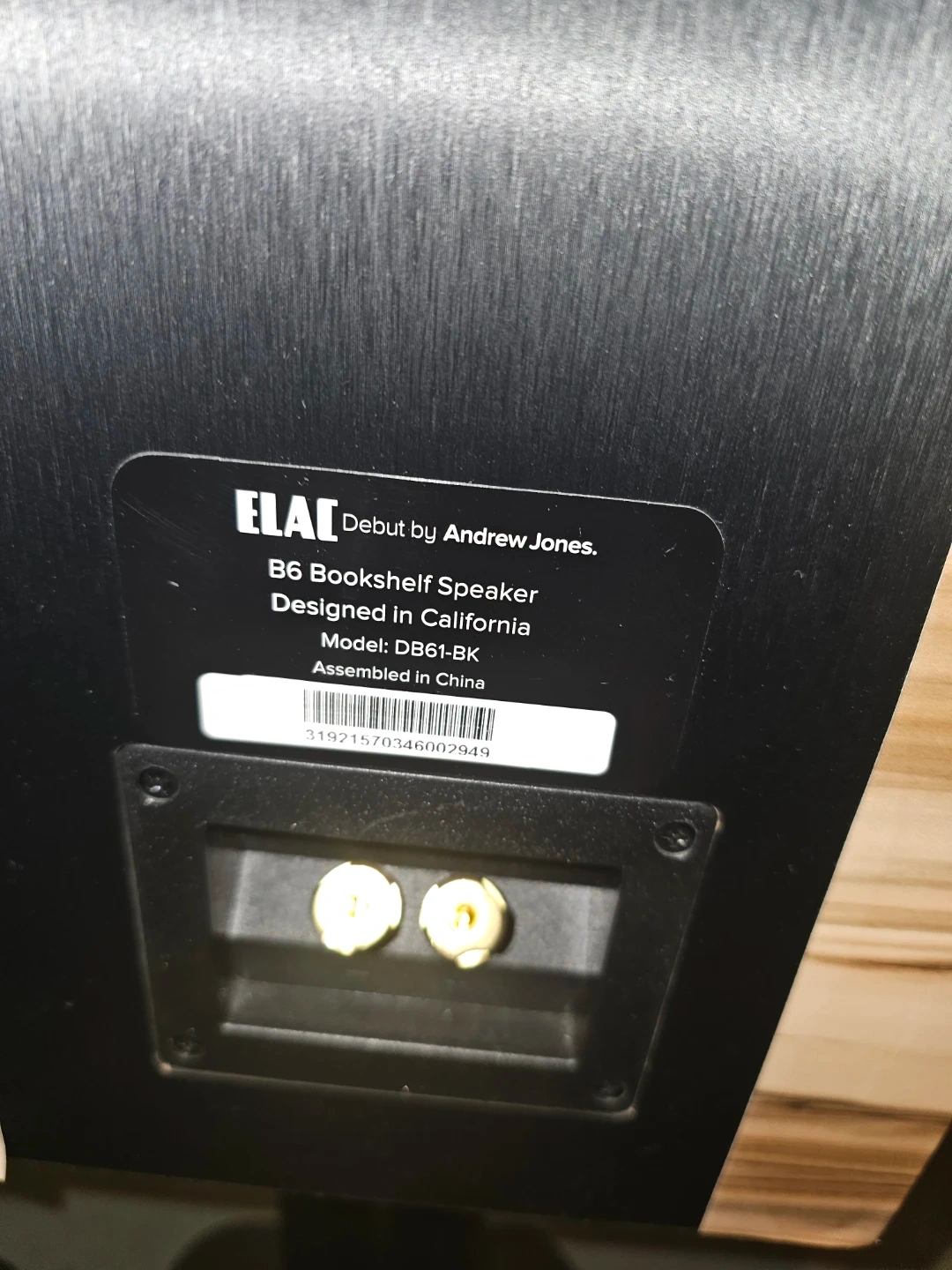 These are ELAC Debut by Andrew Jones B6 bookshelf speakers. They're designed in California and assembled in China. Model DB61-BK. Comes with speaker stands.
