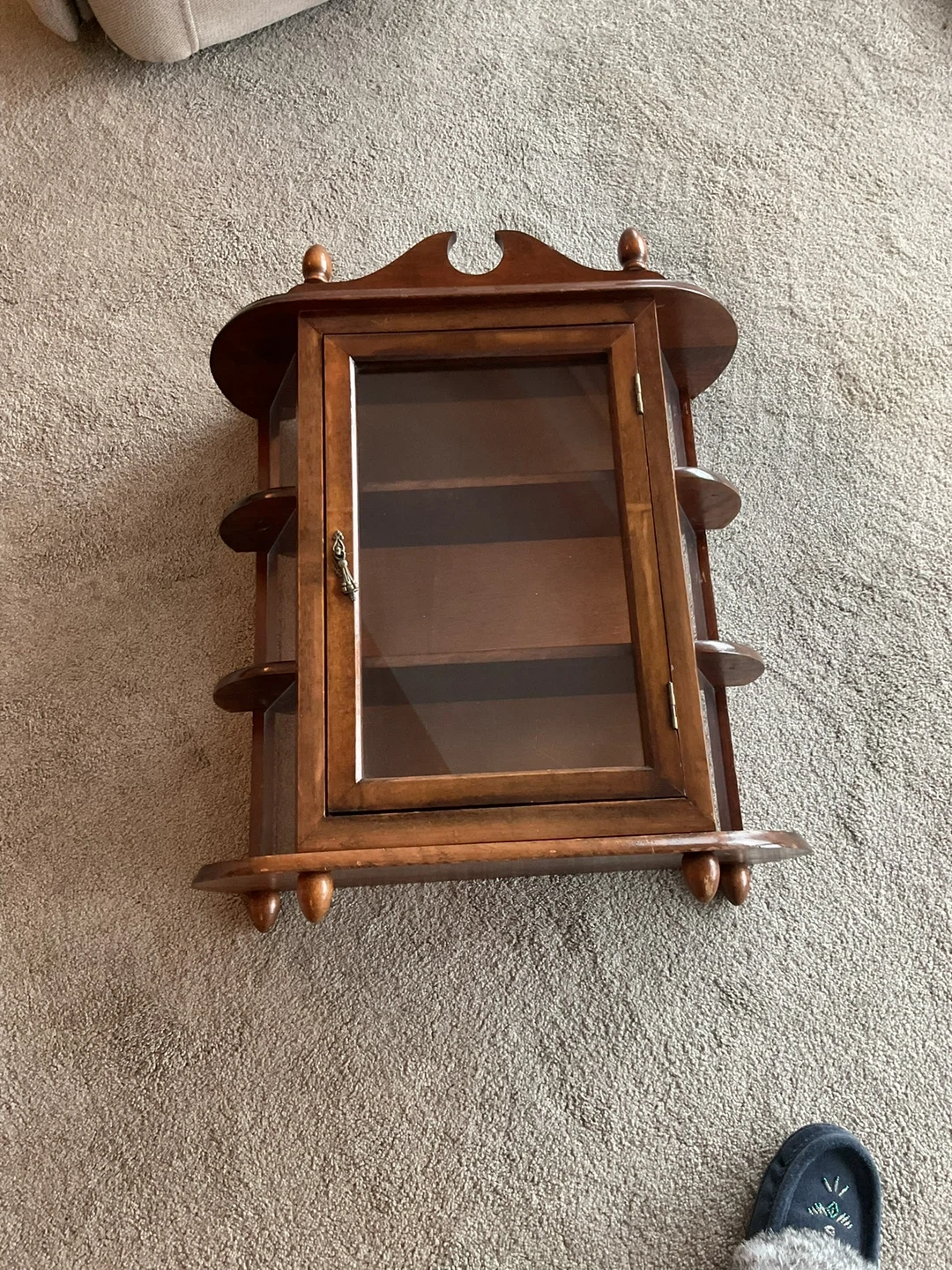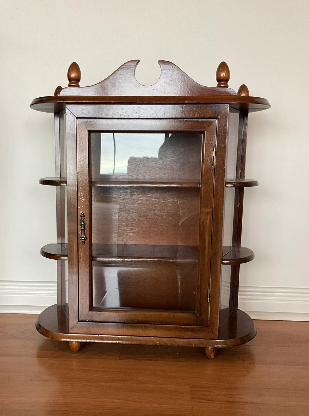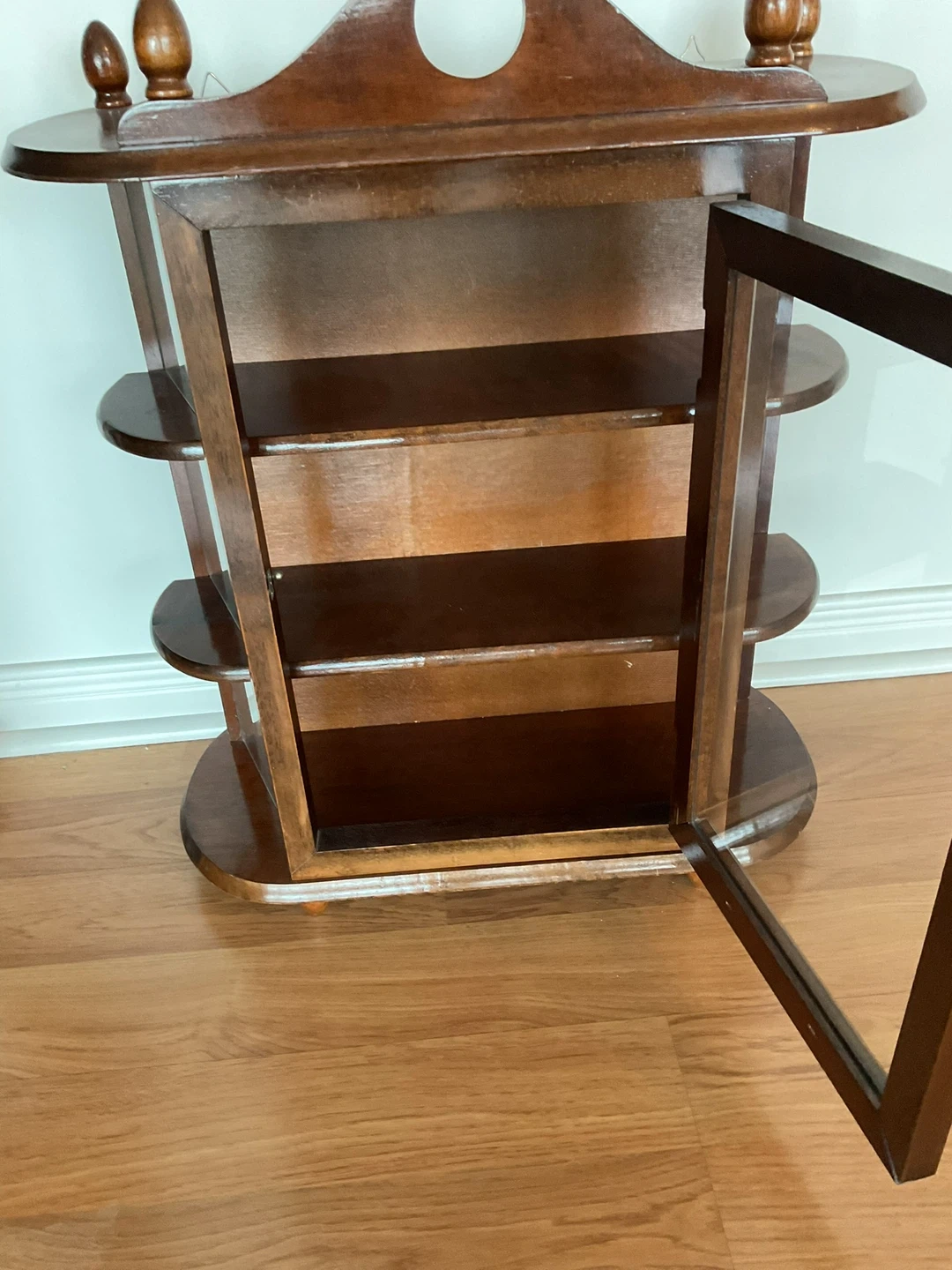 This wooden display cabinet features a glass door and multiple shelves for showcasing collectibles or decor. It's a classic piece with a rich wood finish. It has a decorative top and sides with curio shelves.
