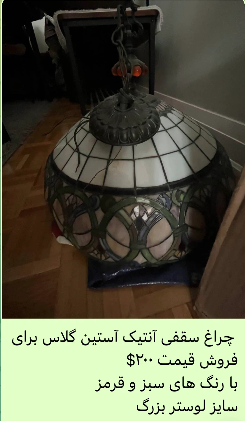 Antique stained glass ceiling lamp with green and red colours. It's a large size. This lamp would add a unique touch to any room!